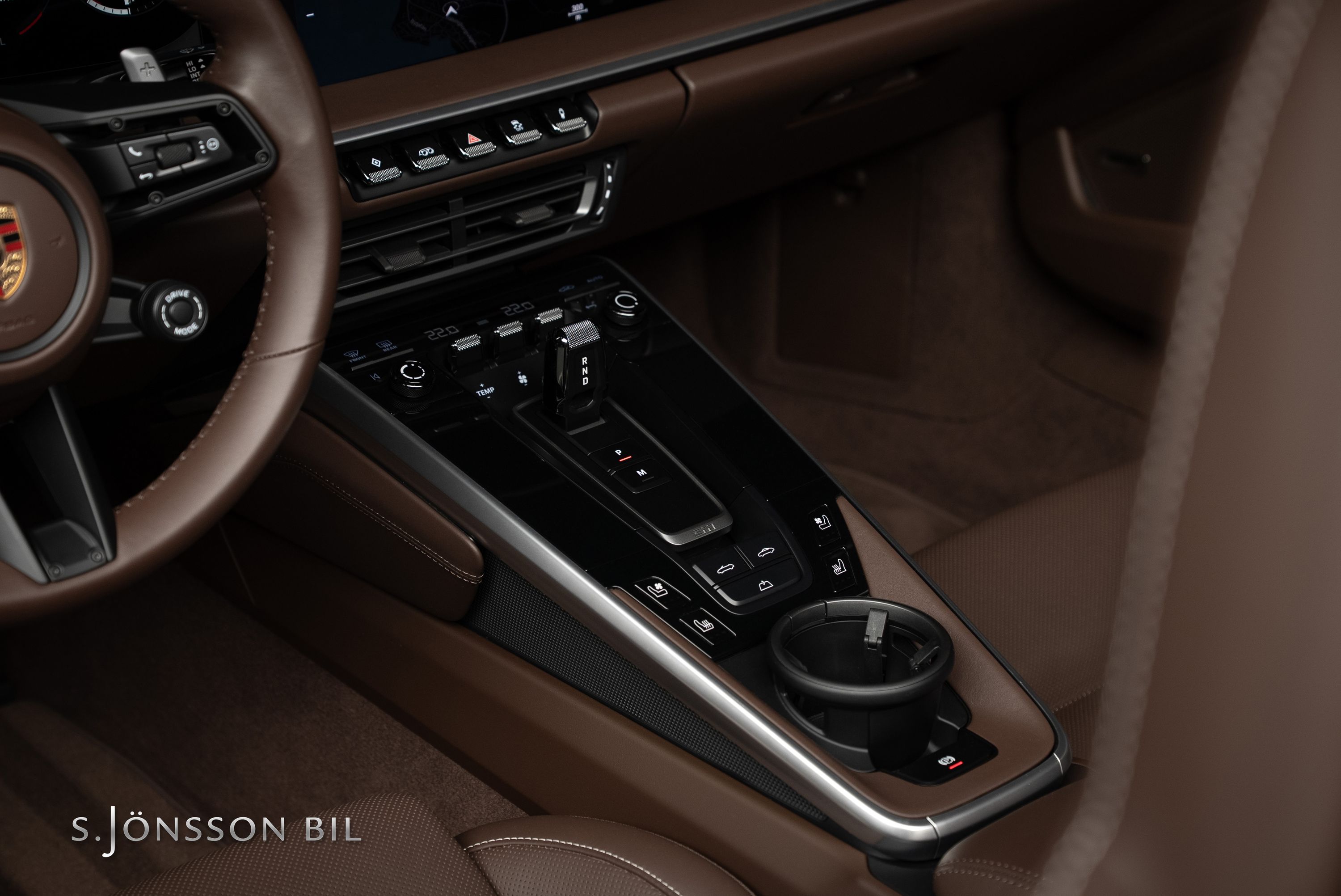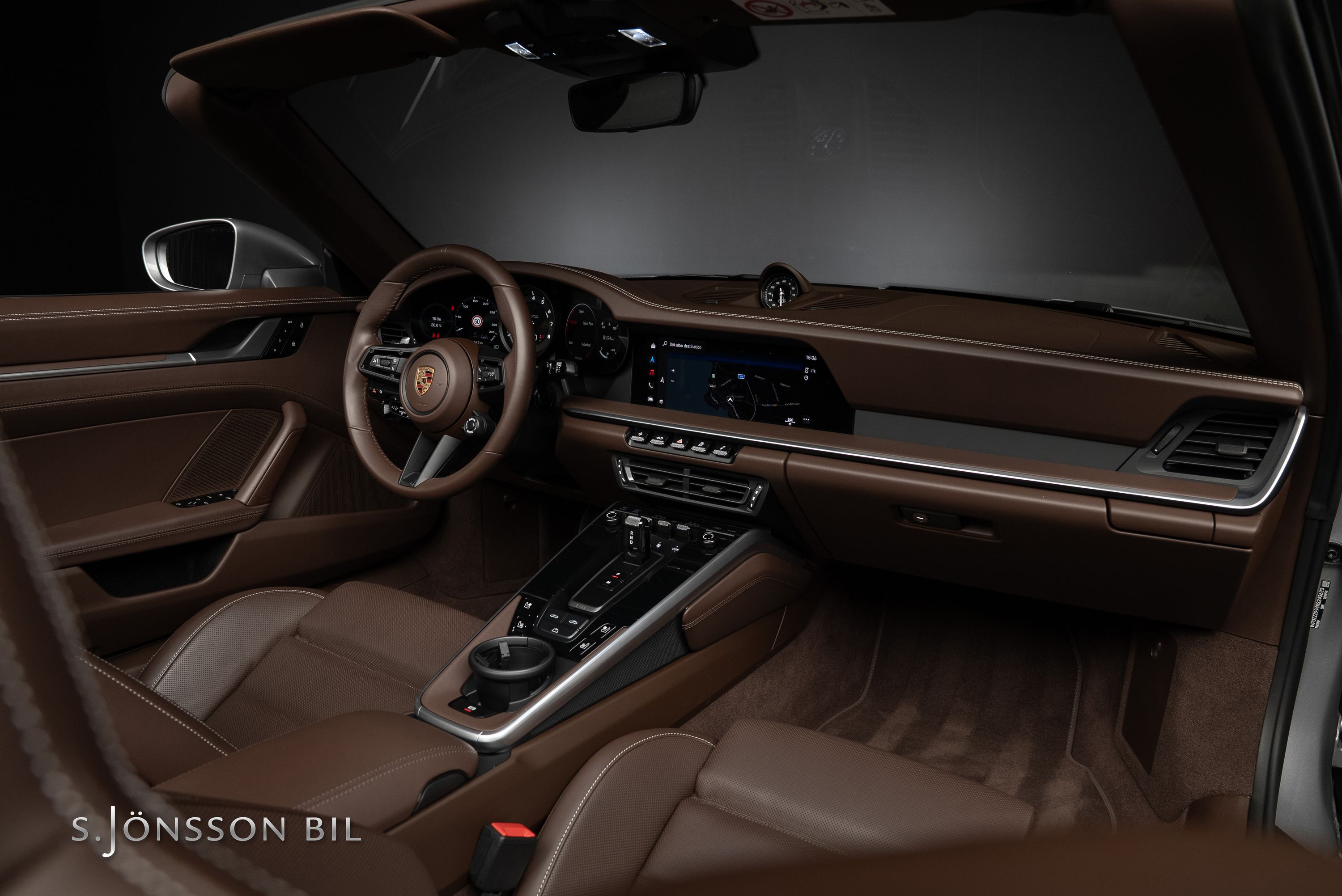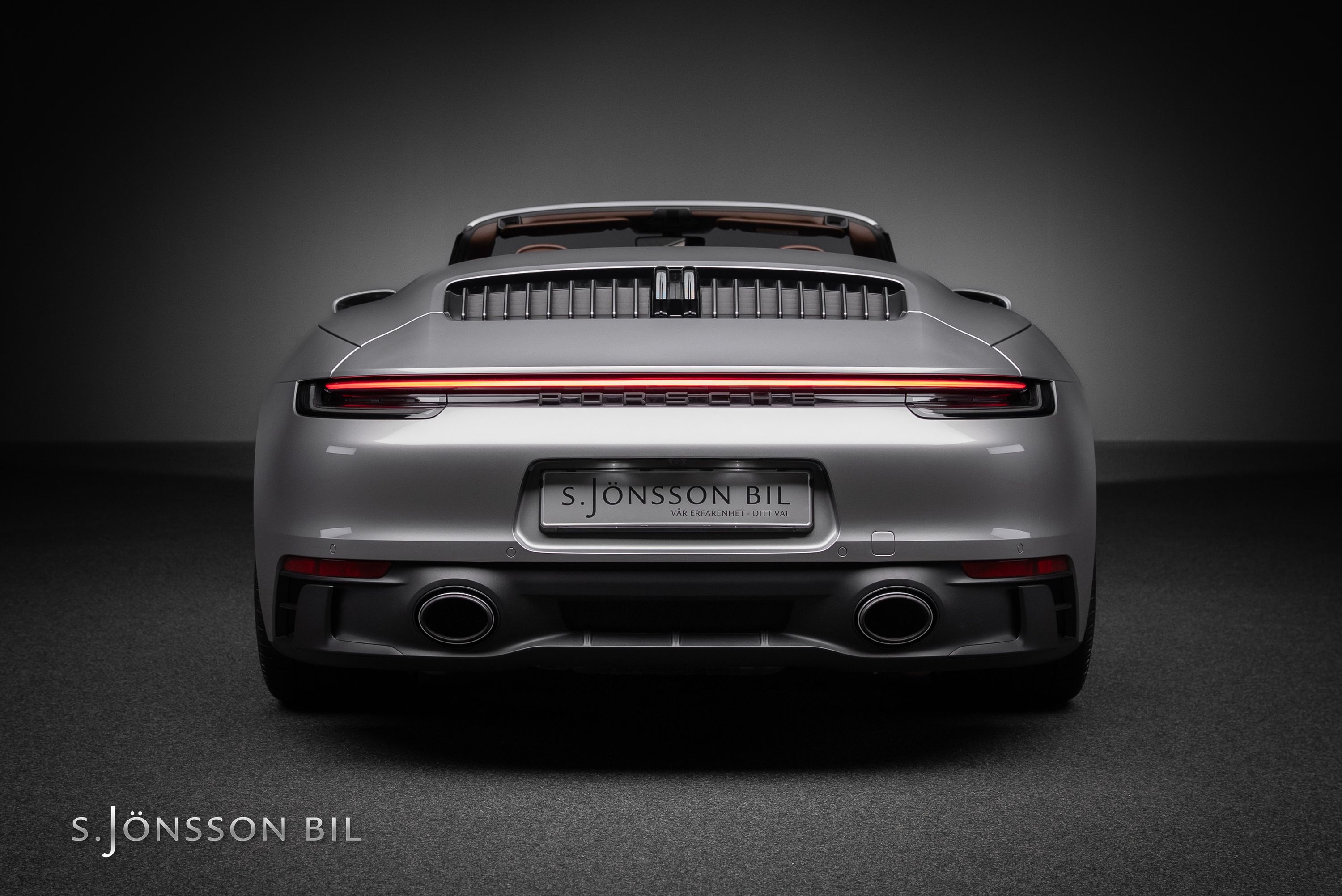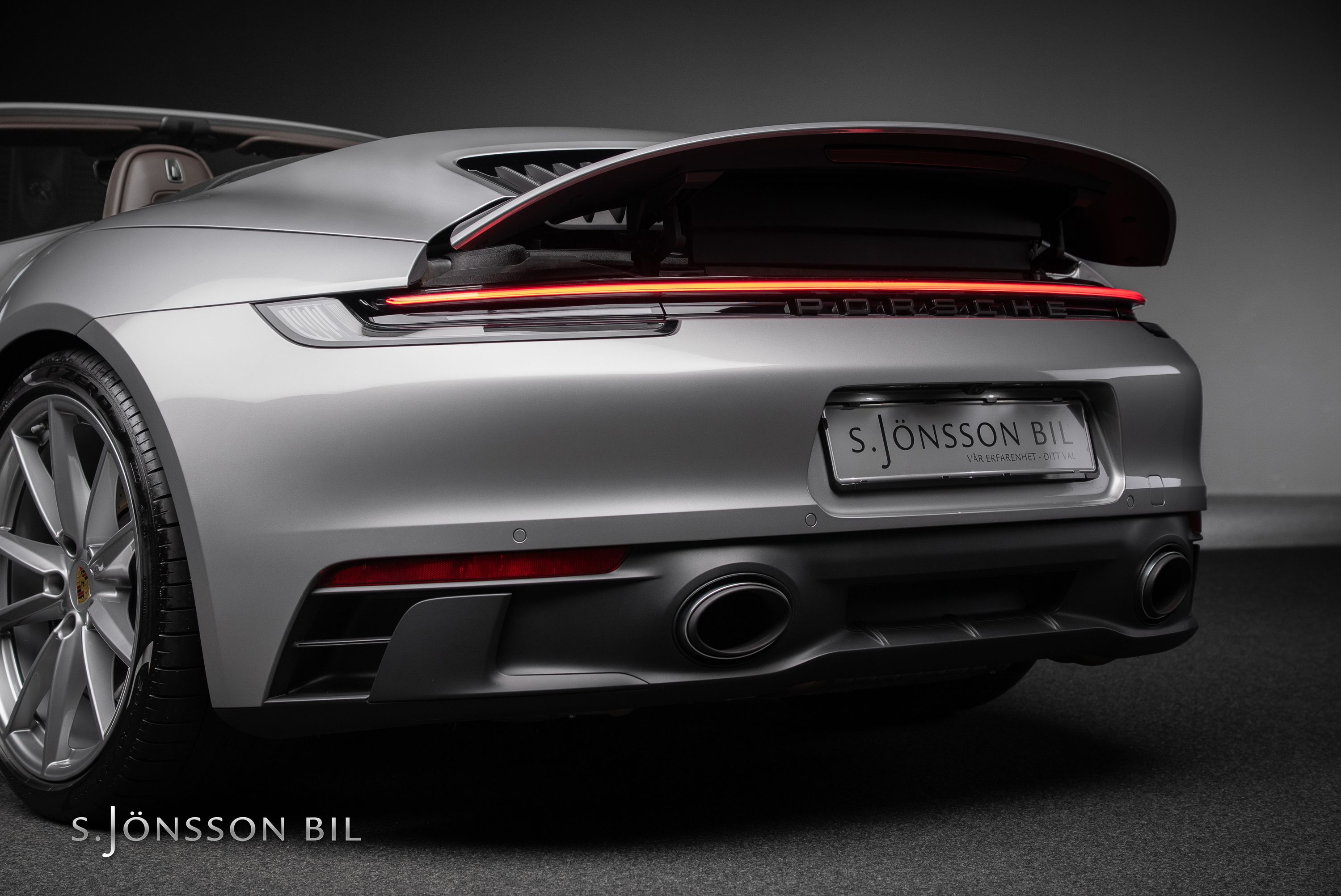 Porsche 992 Carrera 4 GTS Cabriolet, lackerad i den klassiska kulören GT-Silver metallic. Interiör med utökat Club läder i nyansen Truffle Brown och kontrastsömmar i Crayon.
