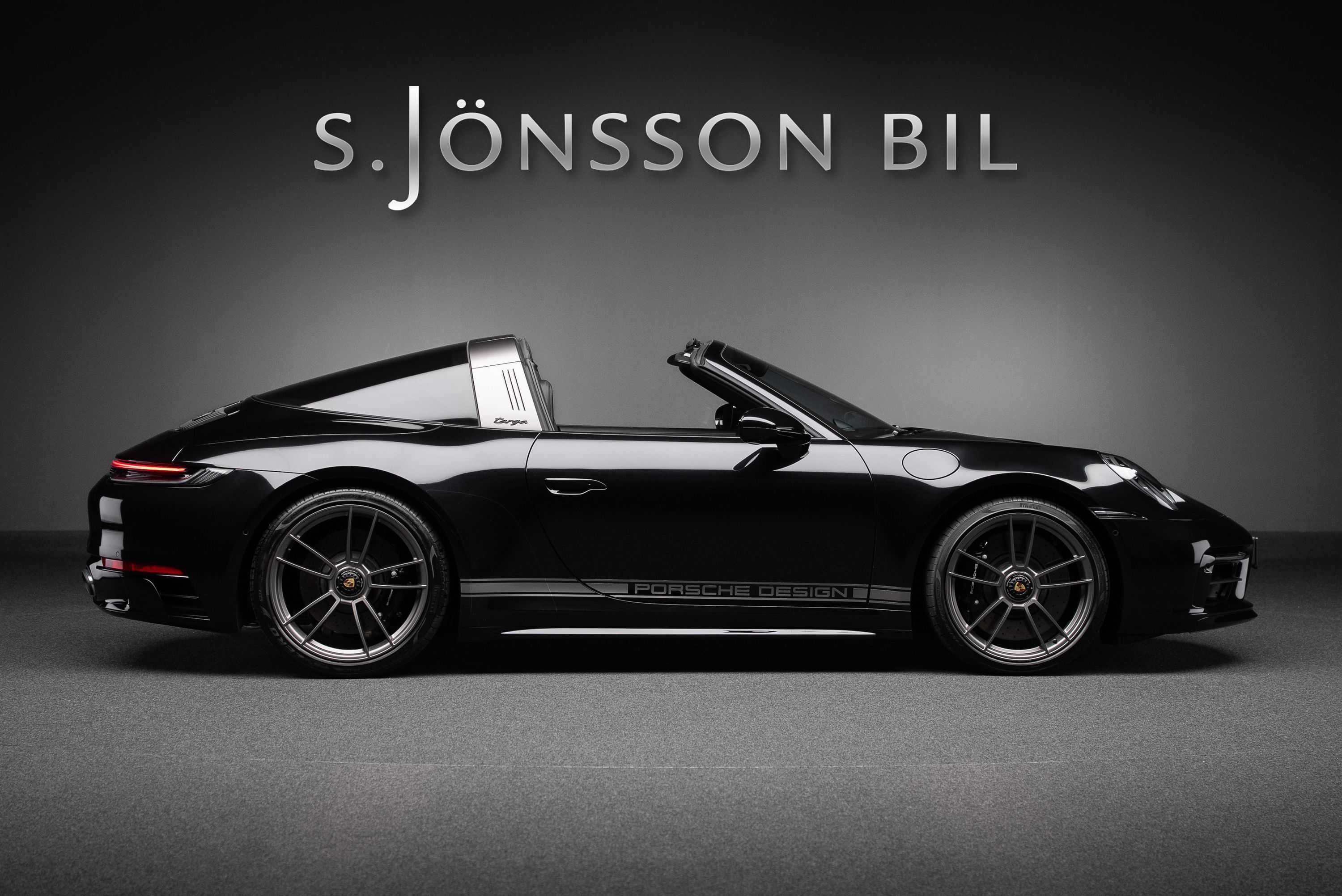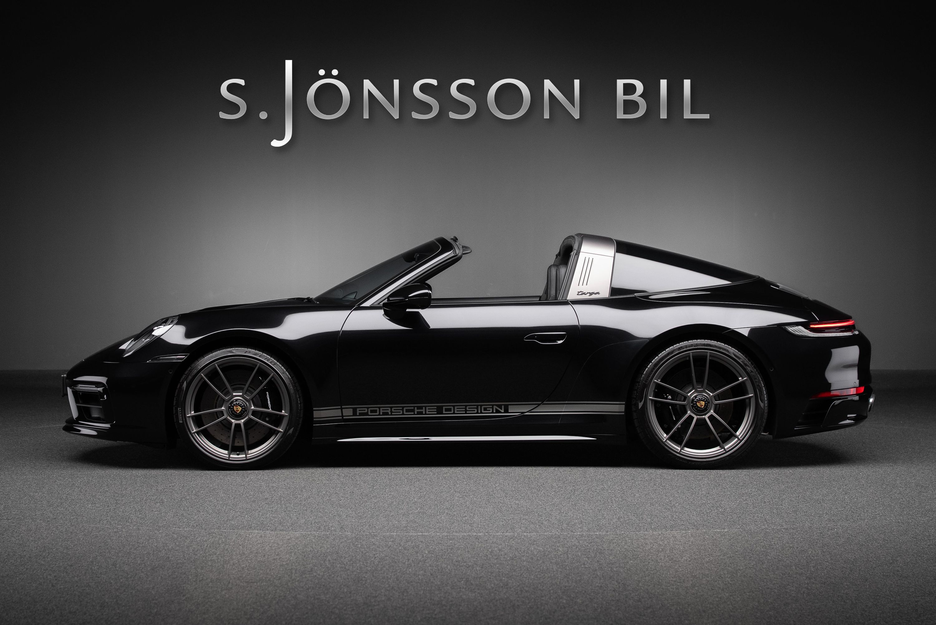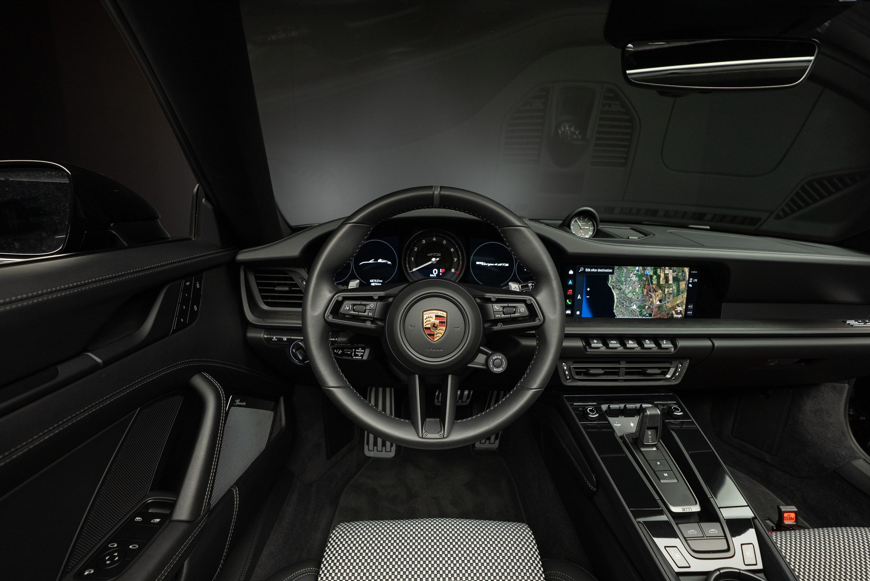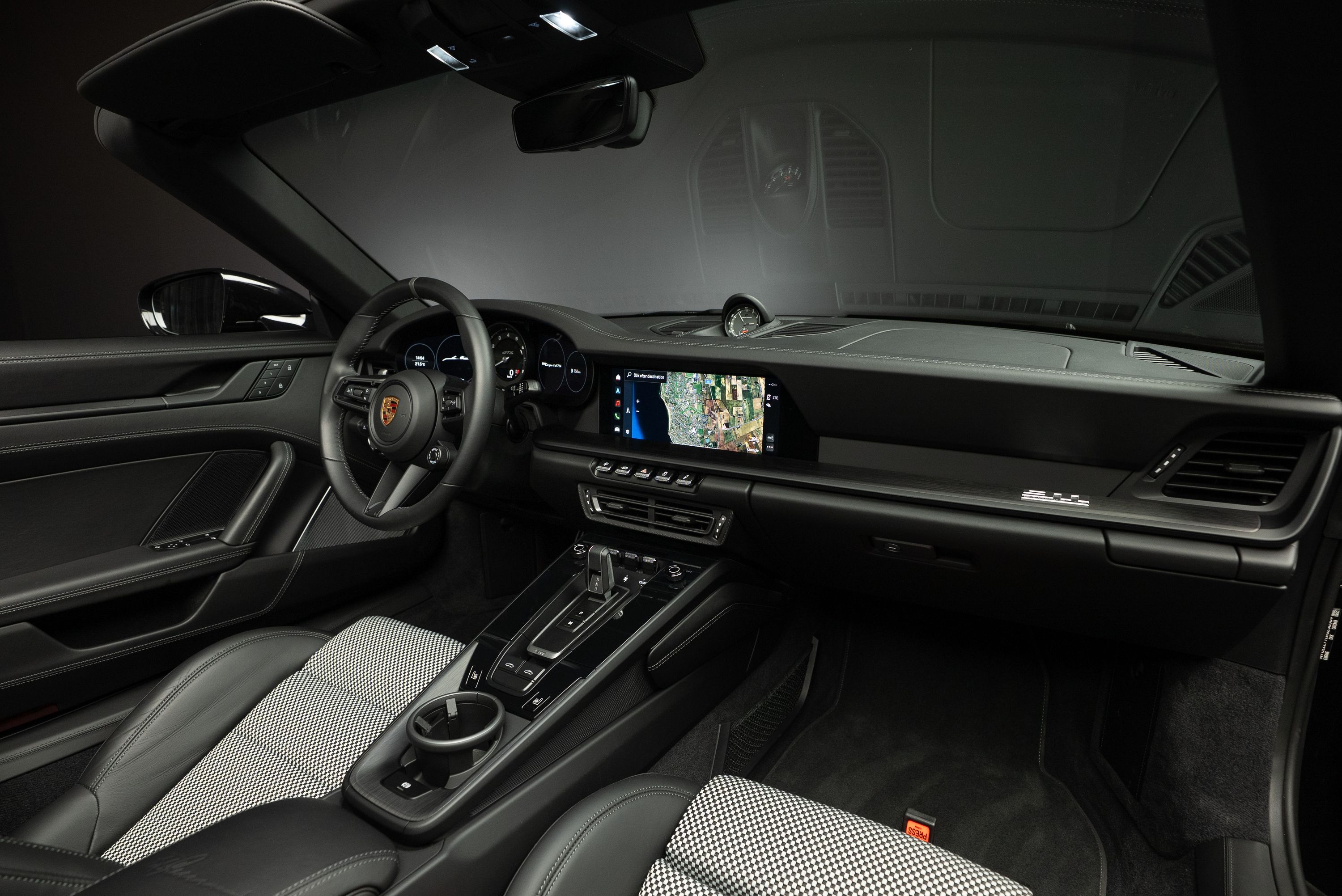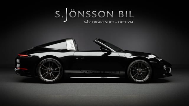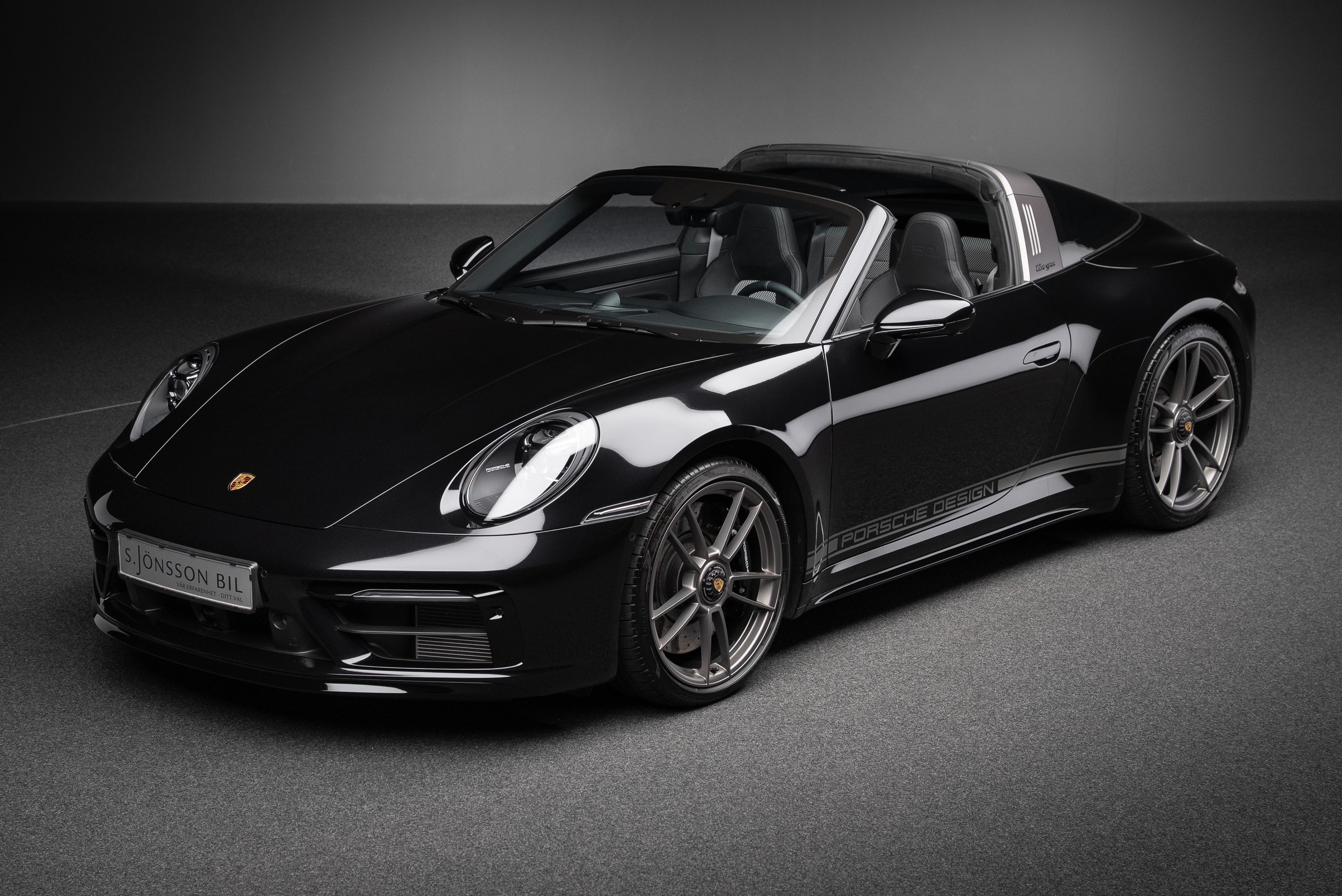 Porsche 992 Targa 4 GTS 50 Years Edition. Lackerad i jet black metallic kombinerat med svart läderinteriör och tyginlägg i pepita mönster.