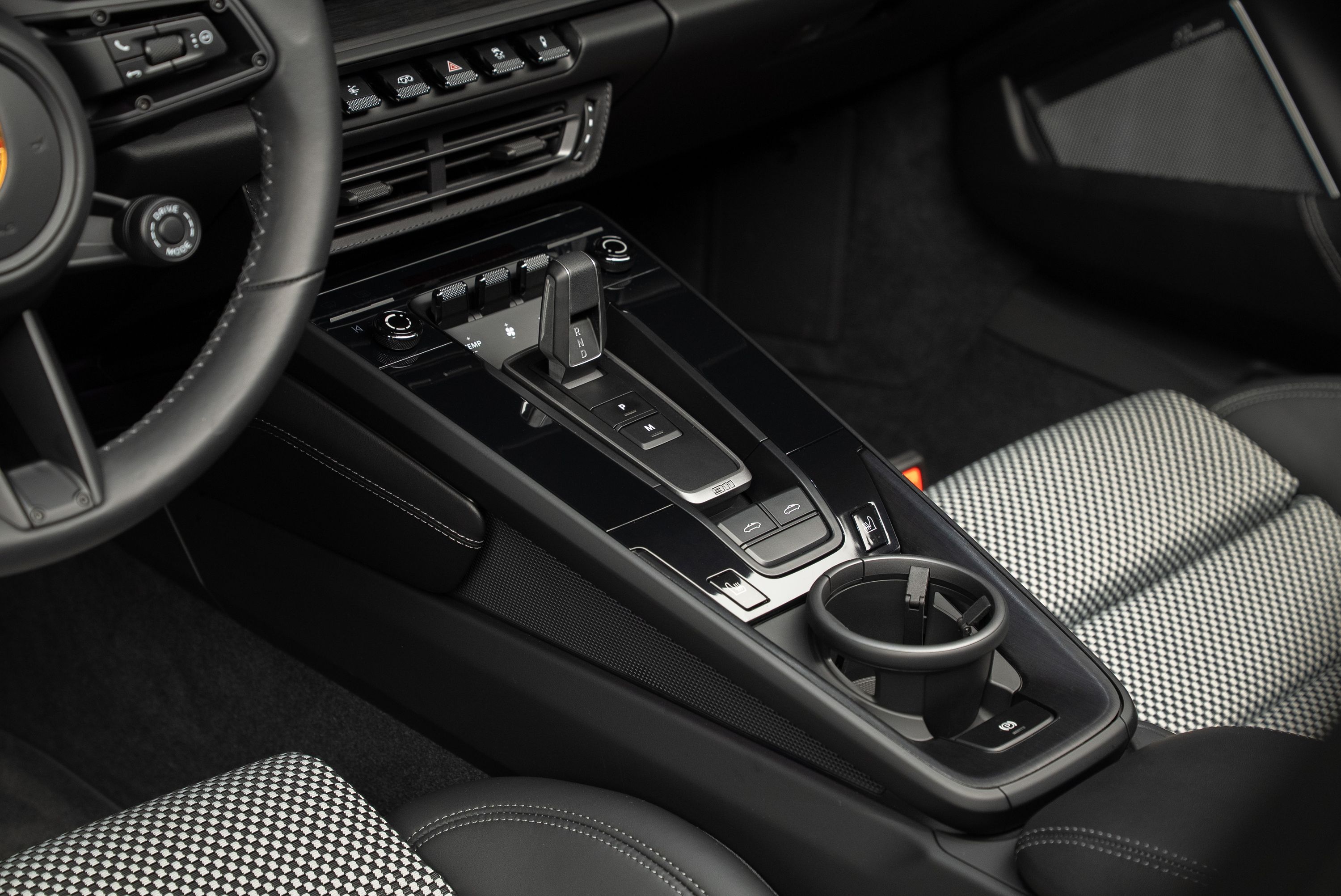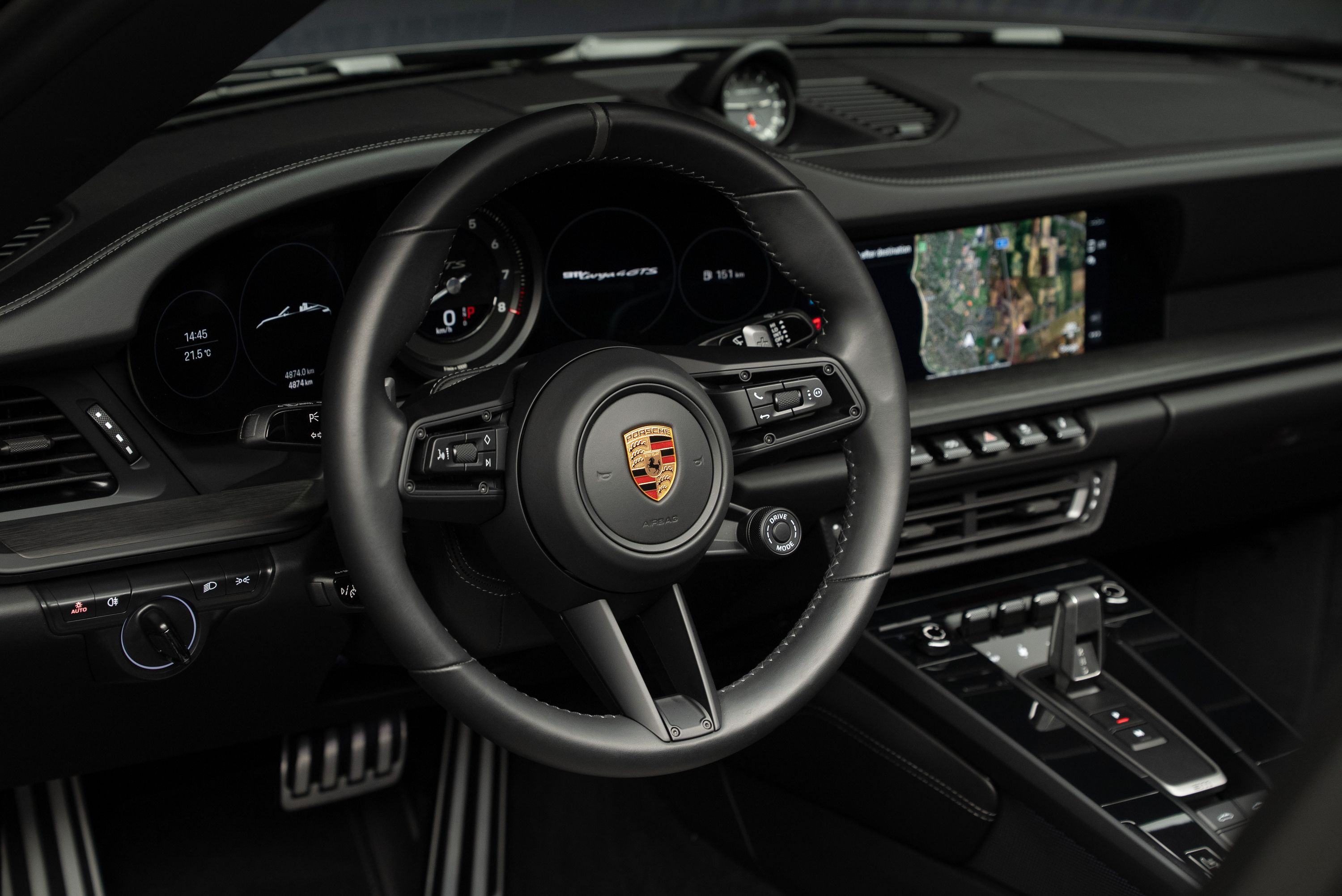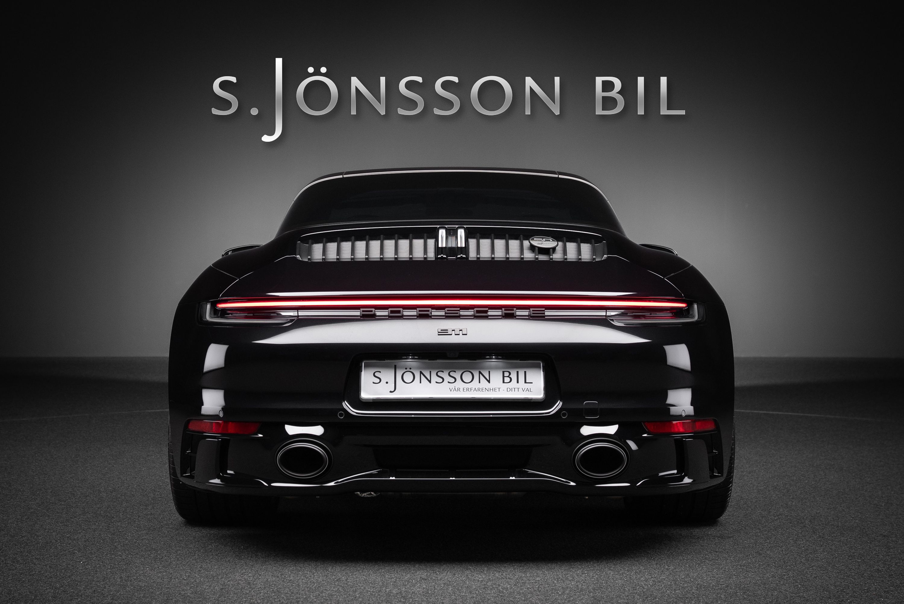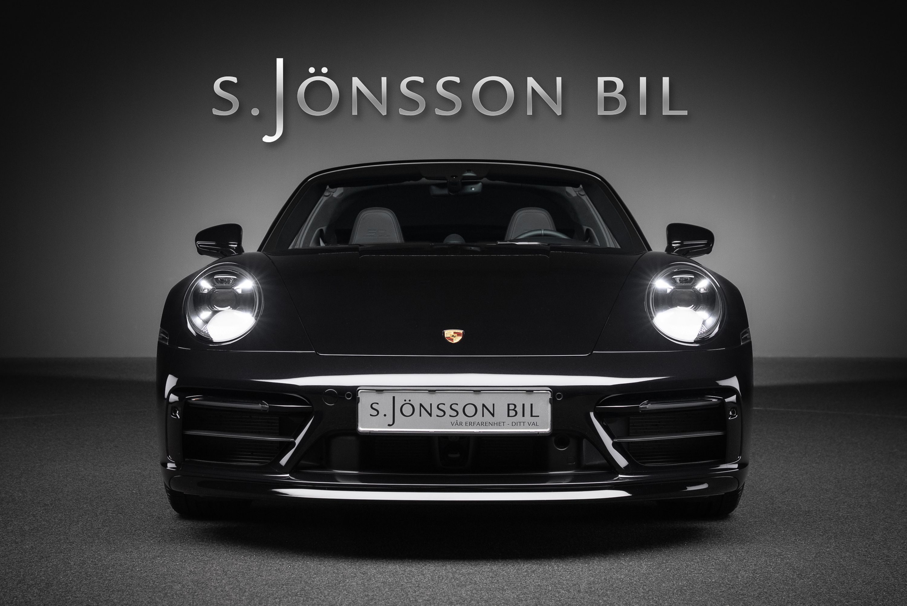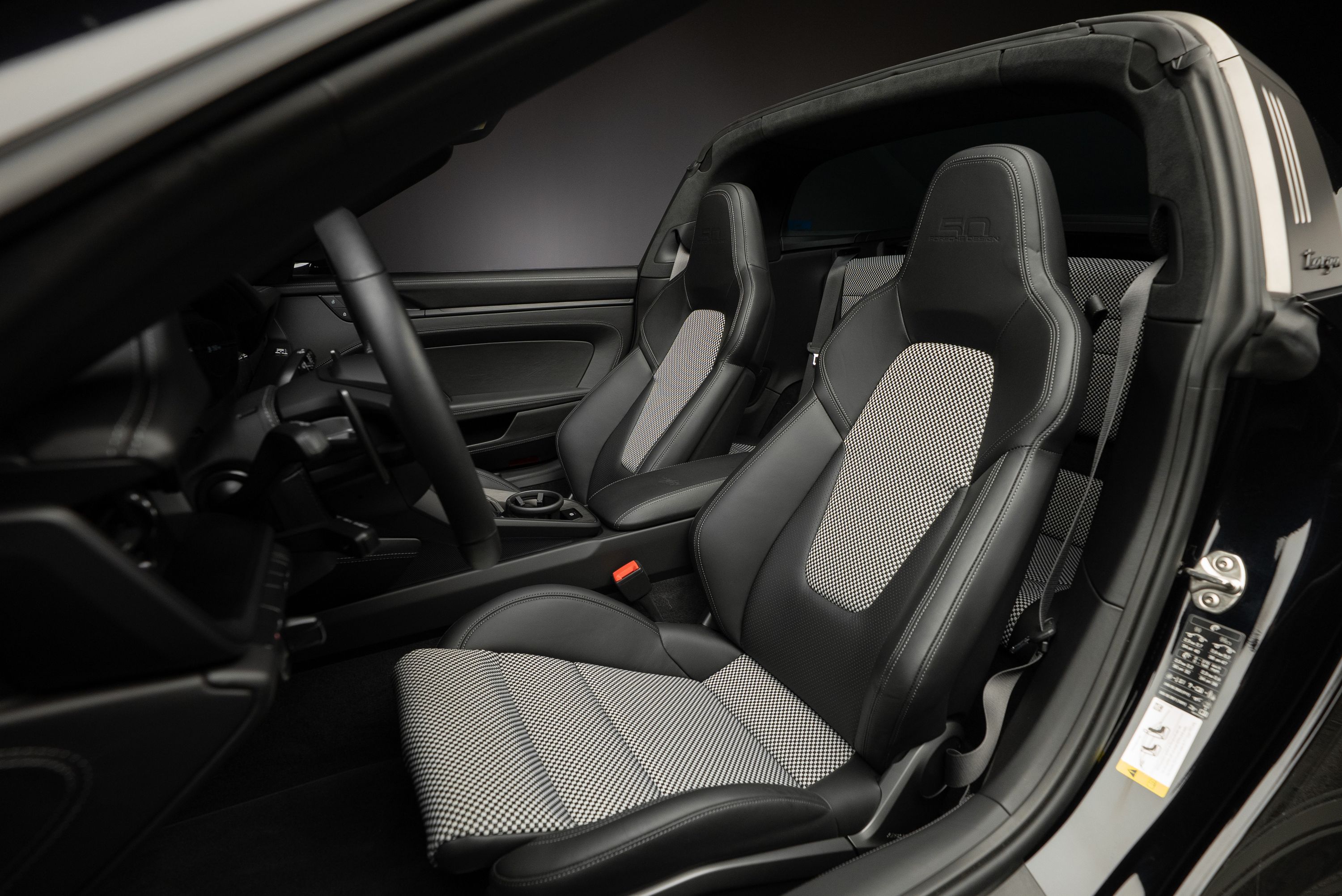 Porsche 992 Targa 4 GTS 50 Years Edition. Lackerad i jet black metallic kombinerat med svart läderinteriör och tyginlägg i pepita mönster.