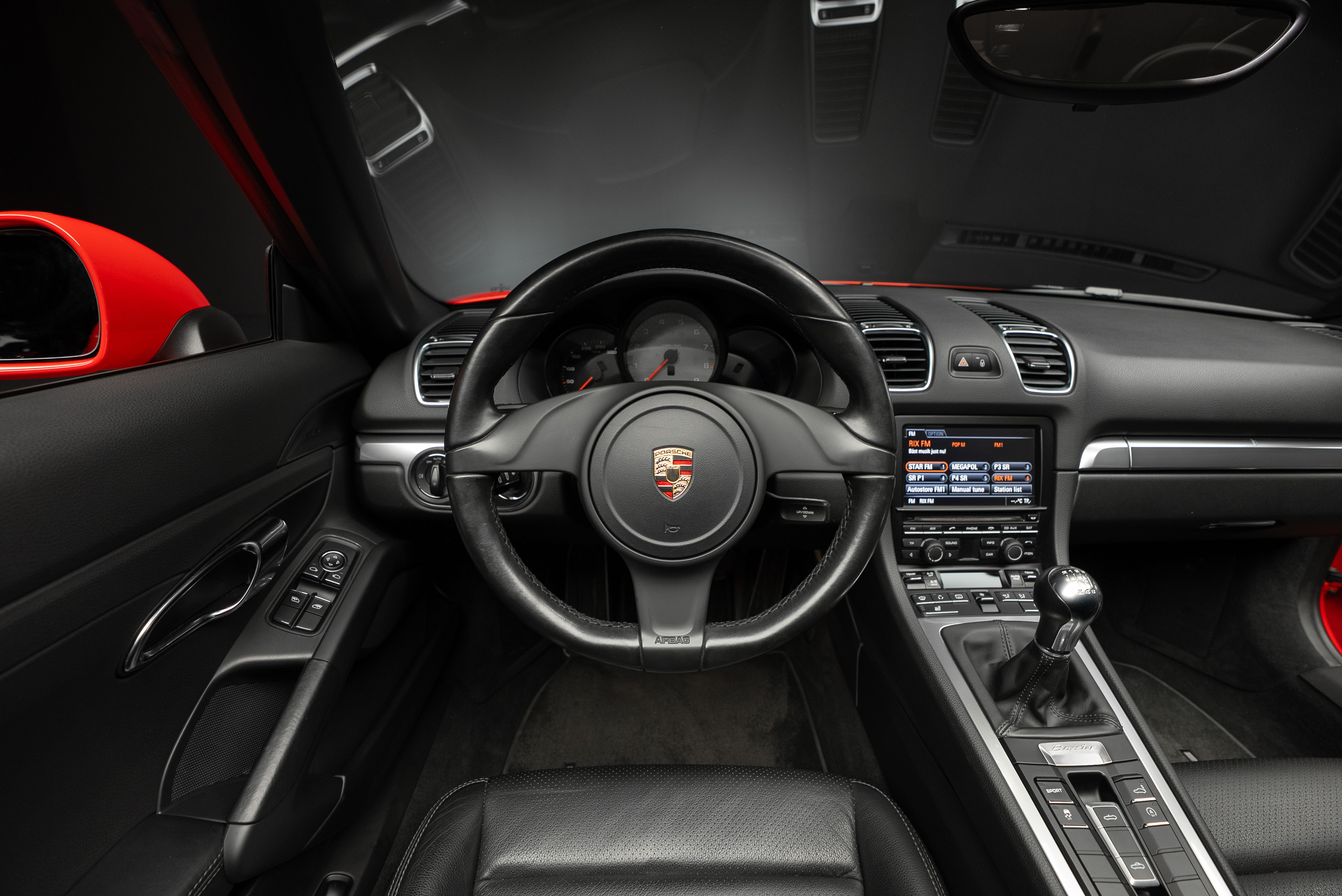 Porsche Boxster S manuell lackerad i röd kombinerat med svart läderinteriör.