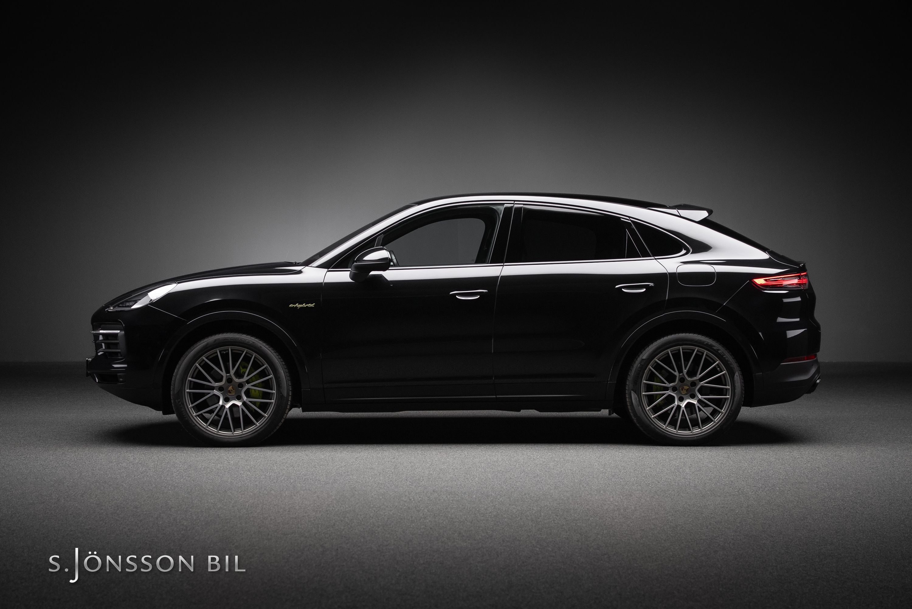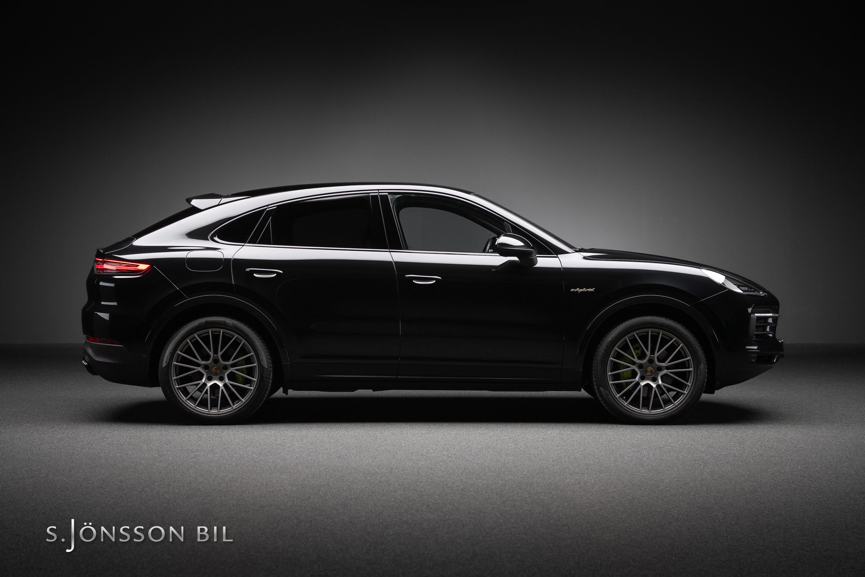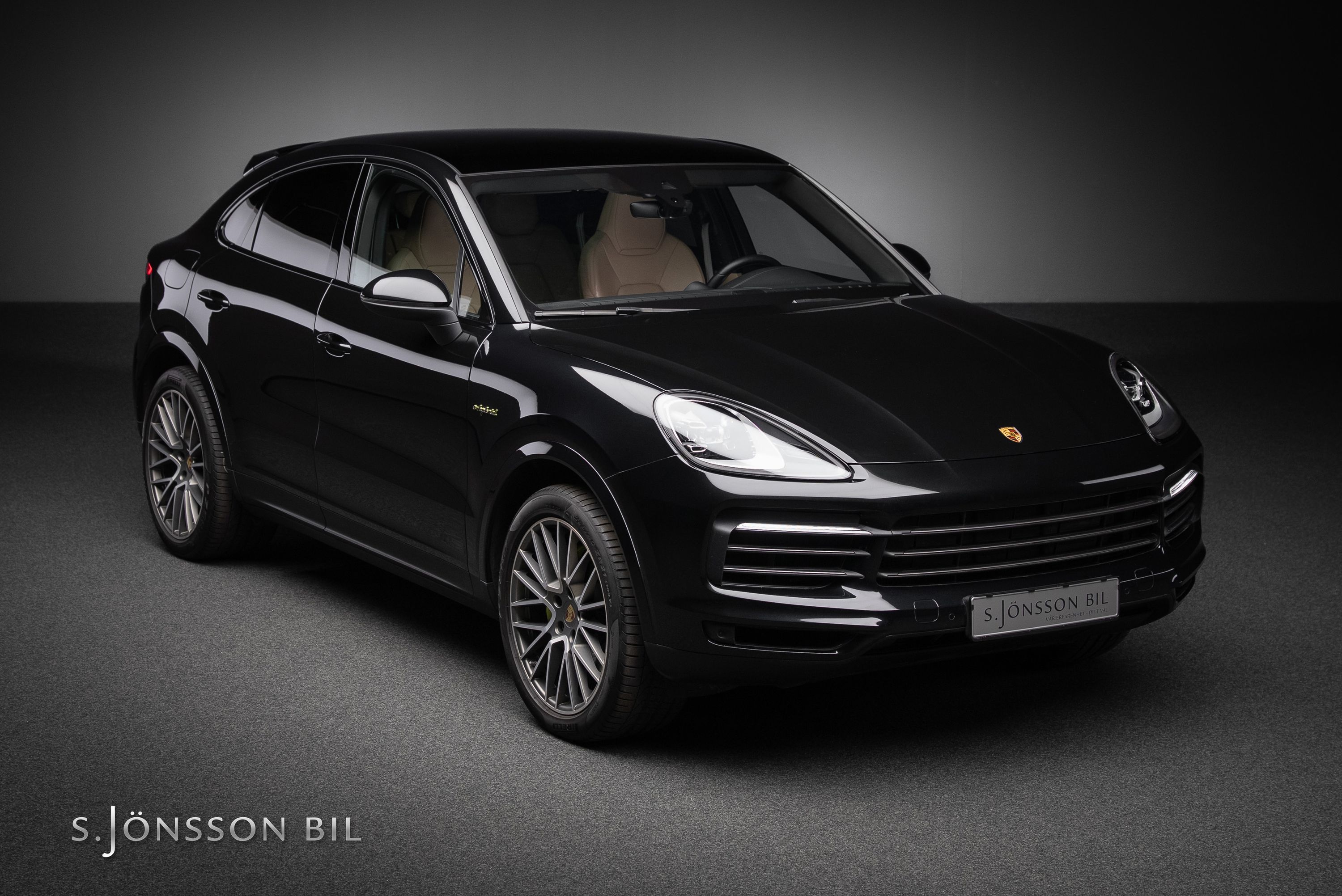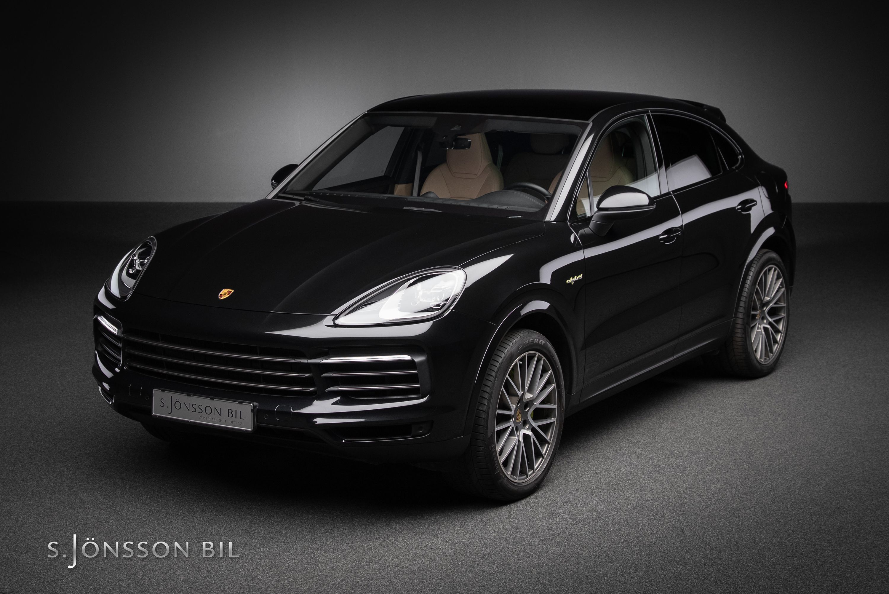 Porsche Cayenne Coupé E-Hybrid Platinum Edition lackerad i Chromite Black Metallic kombinerat med tvåtons läderinteriör i beige/svart. Platinum Edition var en specialutgåva som innebar en rad exklusiva designdetaljer så som ”PORSCHE” logotypen som integrerats i den bakre ljusrampen, modellbeteckningen baktill, 21-tumsfälgarna i RS Spyder-design samt detaljer i Satin Platinum. På en laddning så kommer man upp till 47 km enligt WLTP med batteriet på 17,9 kWh.