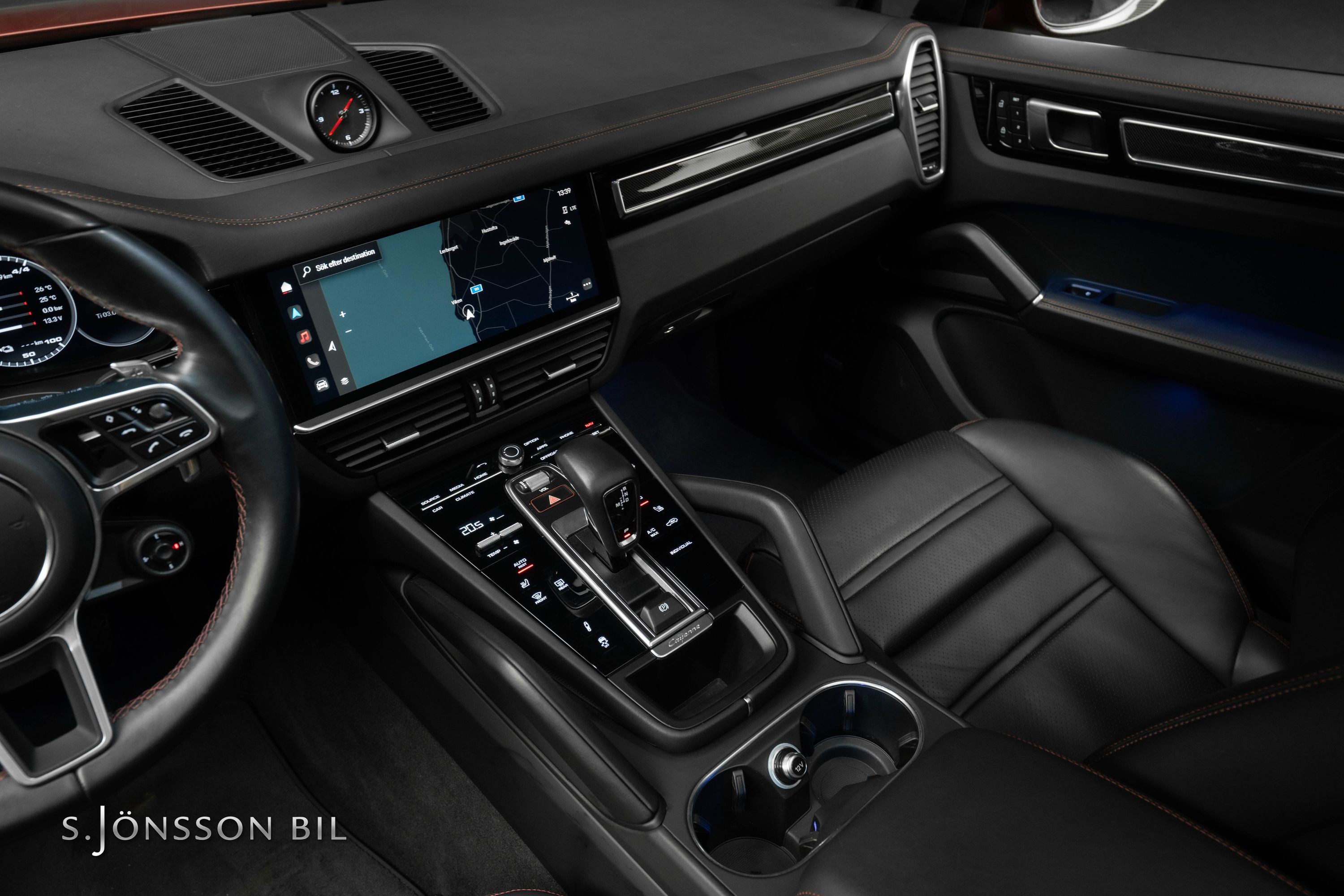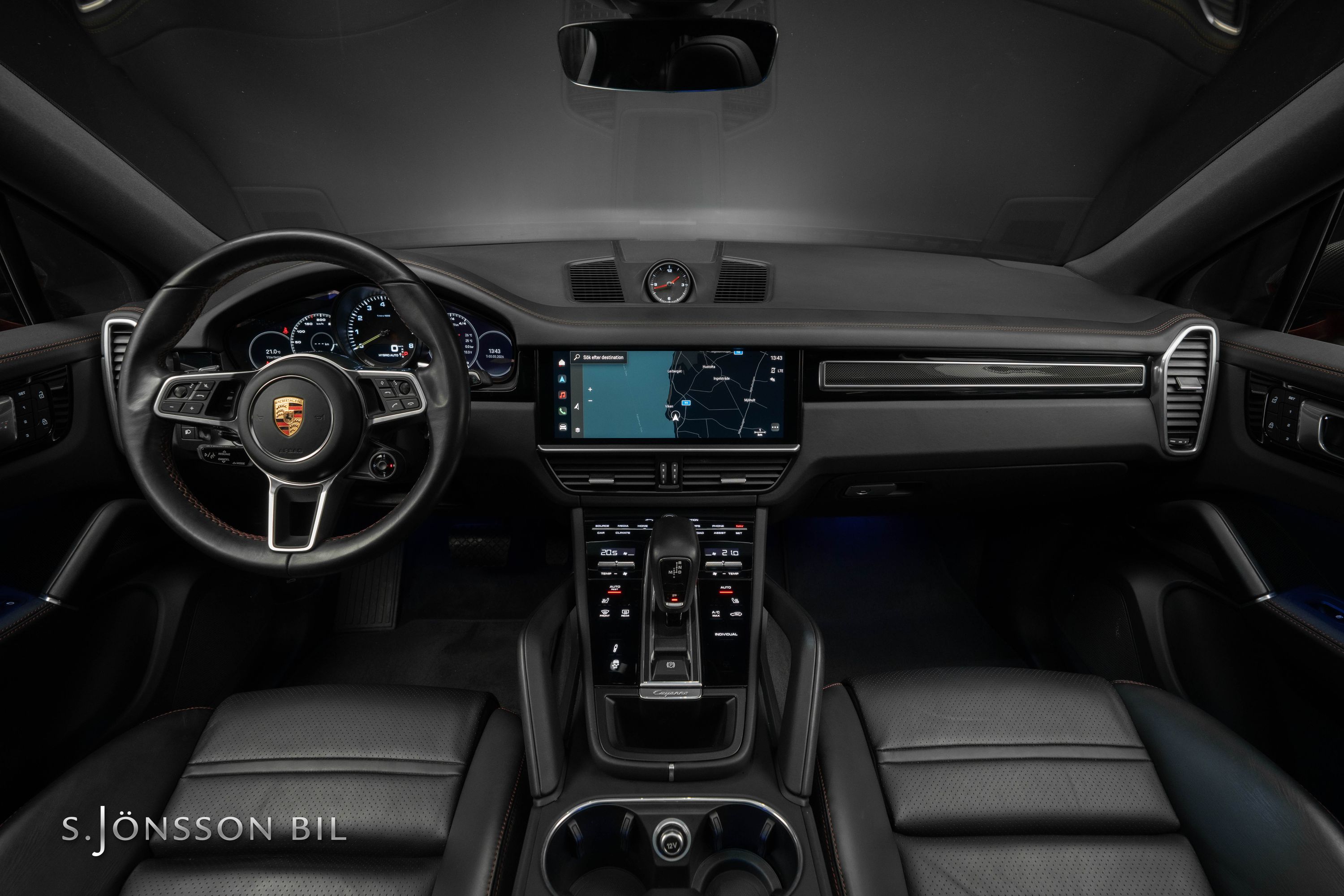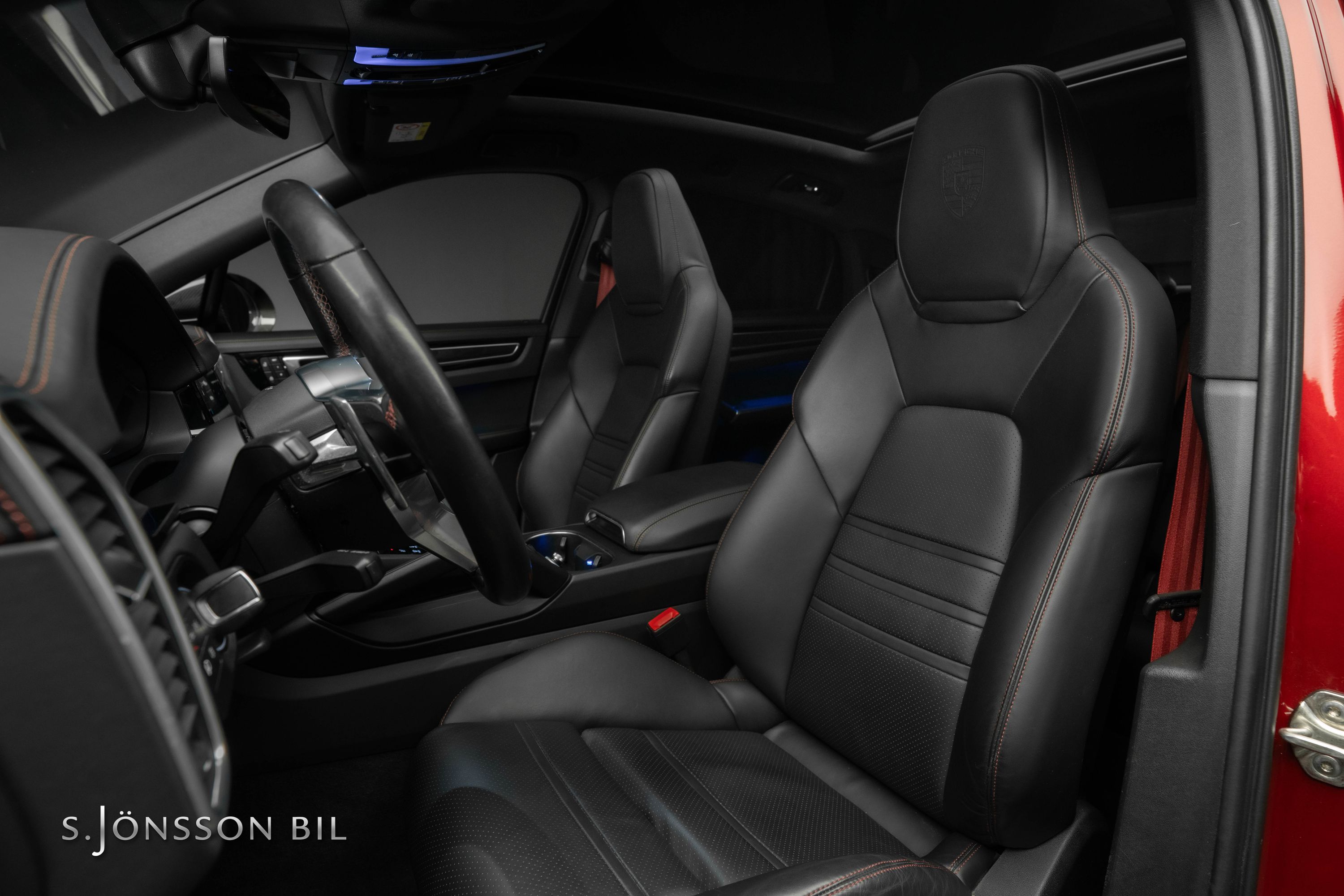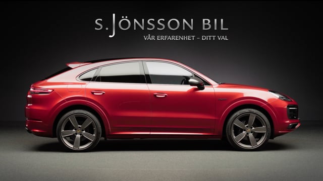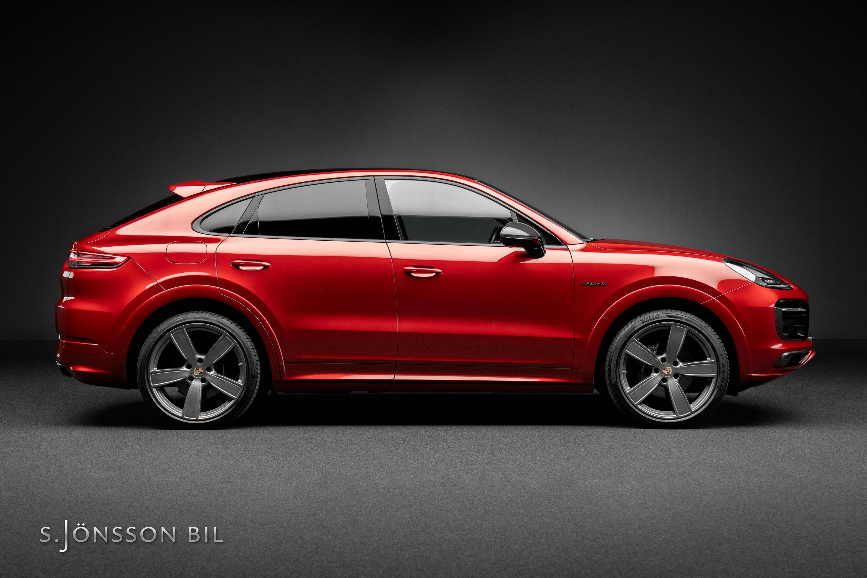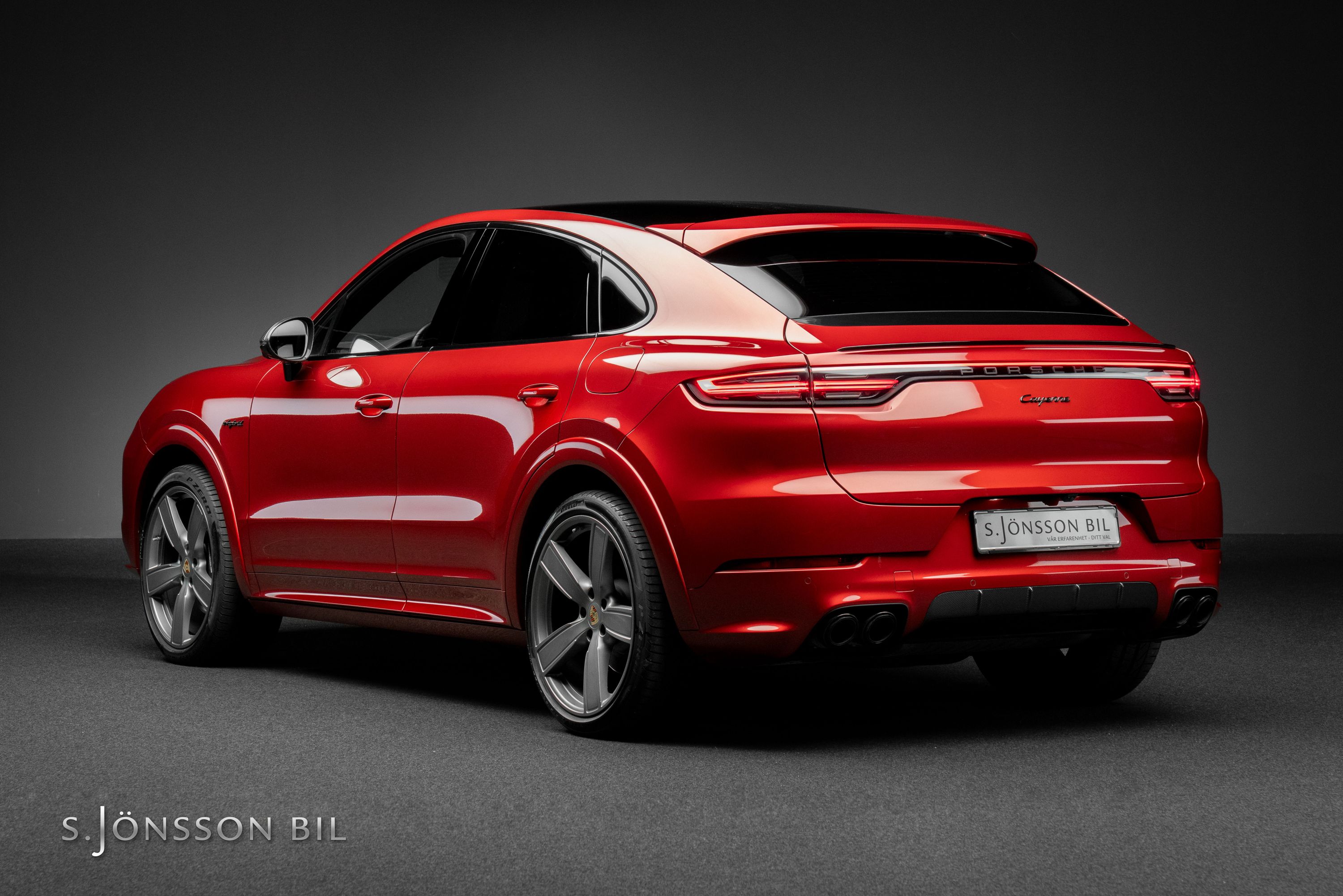 Porsche Cayenne Coupé lackerad i den unika PTS färgen Ruby Red metallic. Läderinteriör i svart med kontrastsömmar i rött.