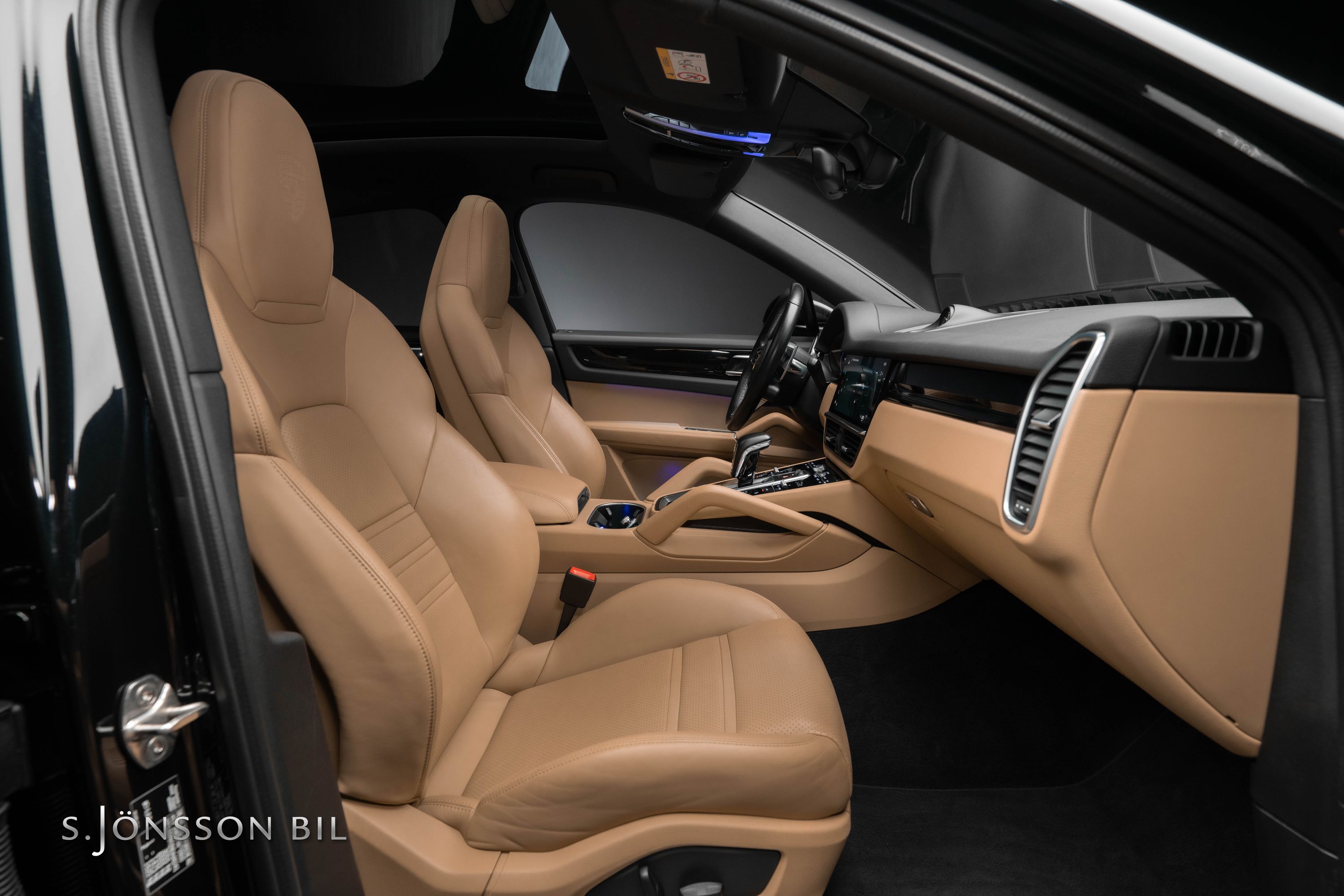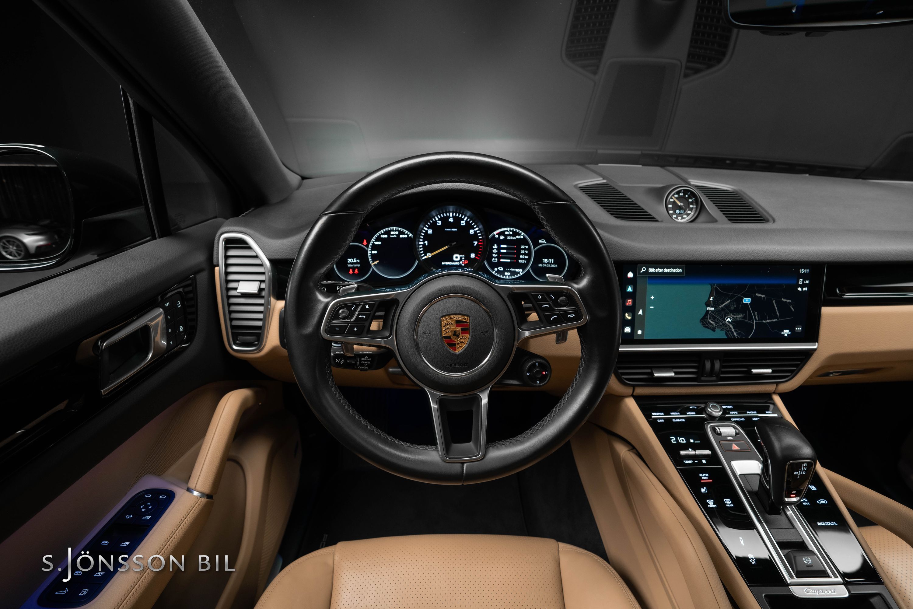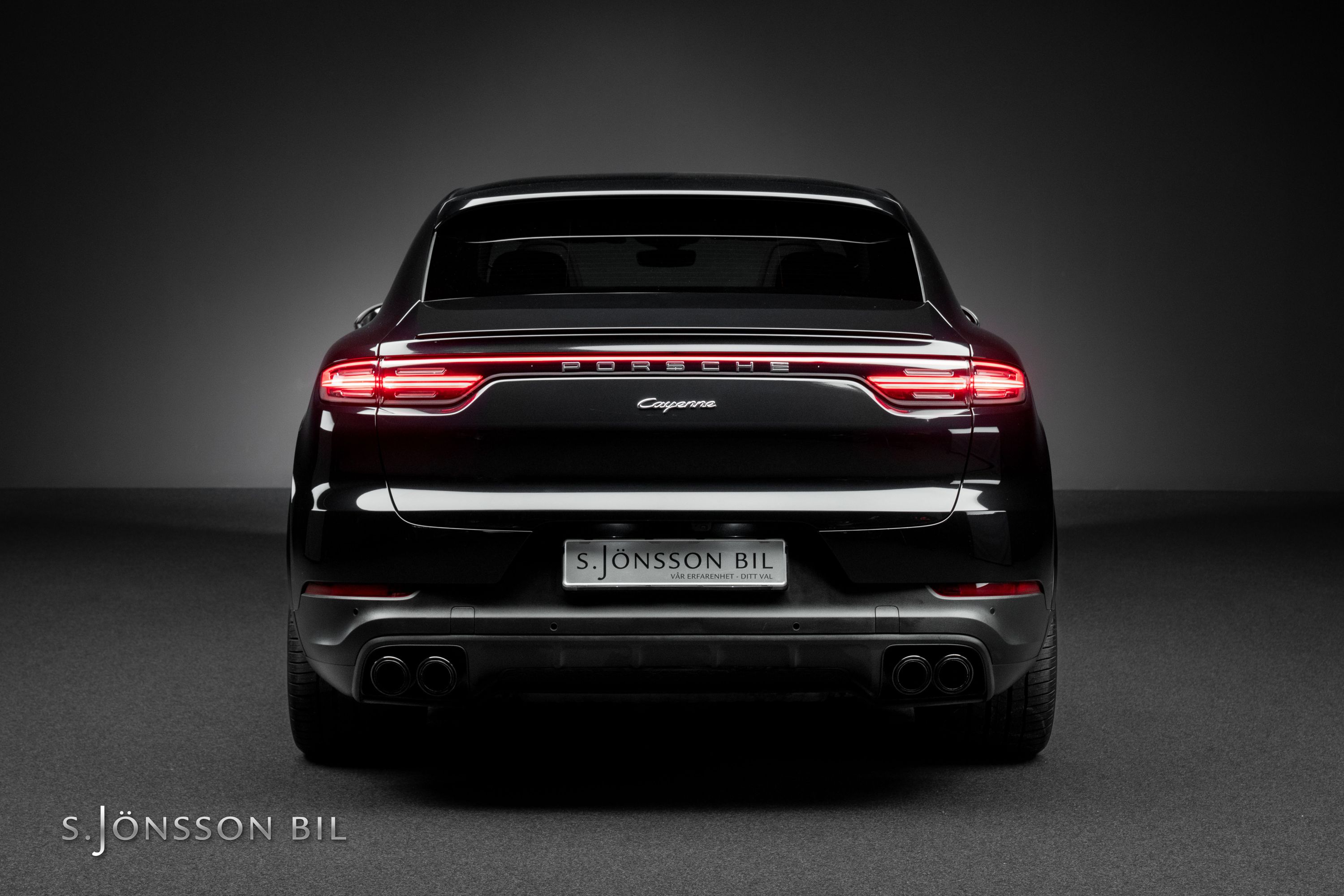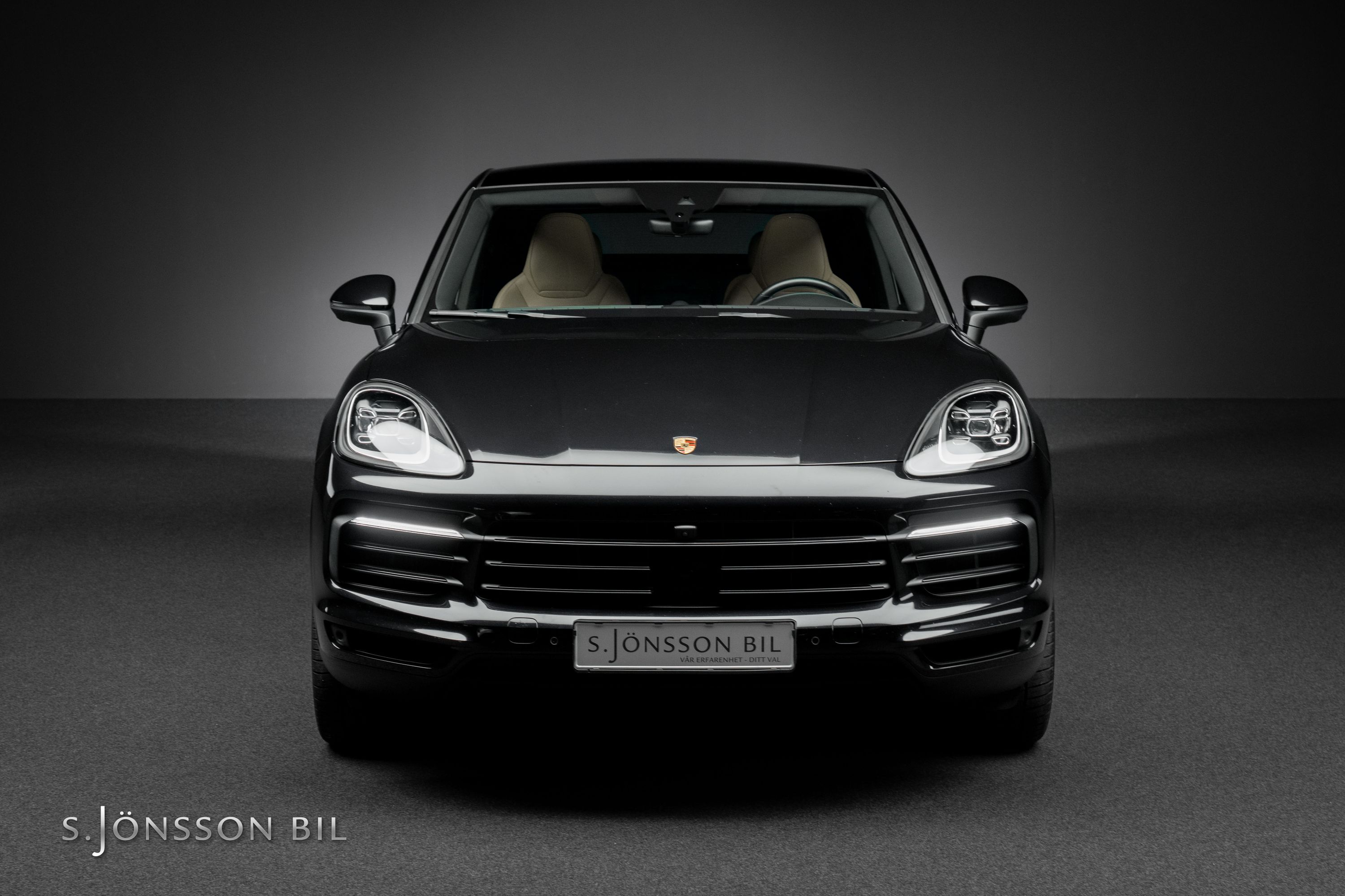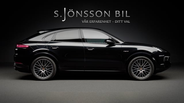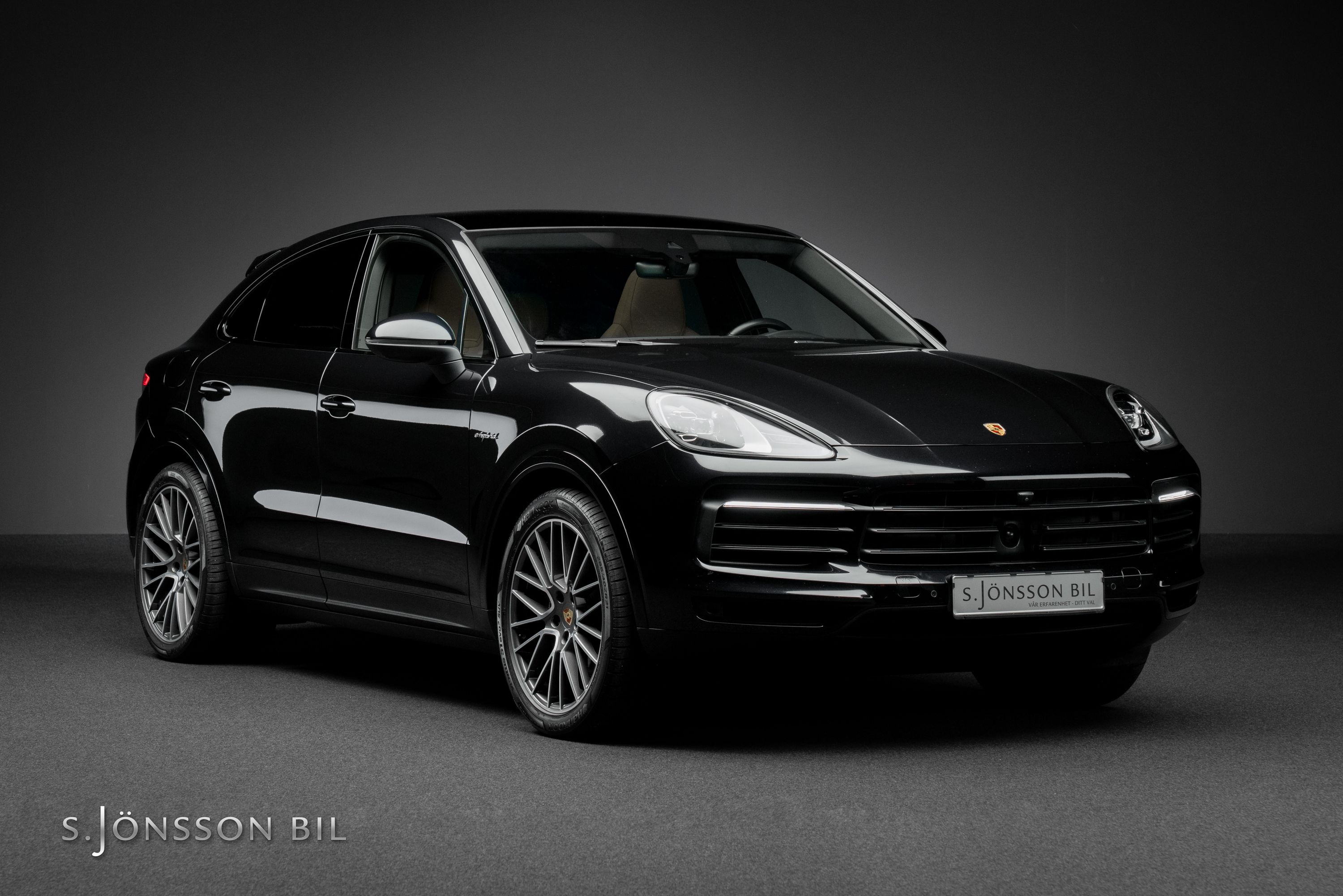 Porsche Cayenne Coupé E-Hybrid lackerad i Jet Black Metallic kombinerat med tvåtons läderinteriör i beige/svart.