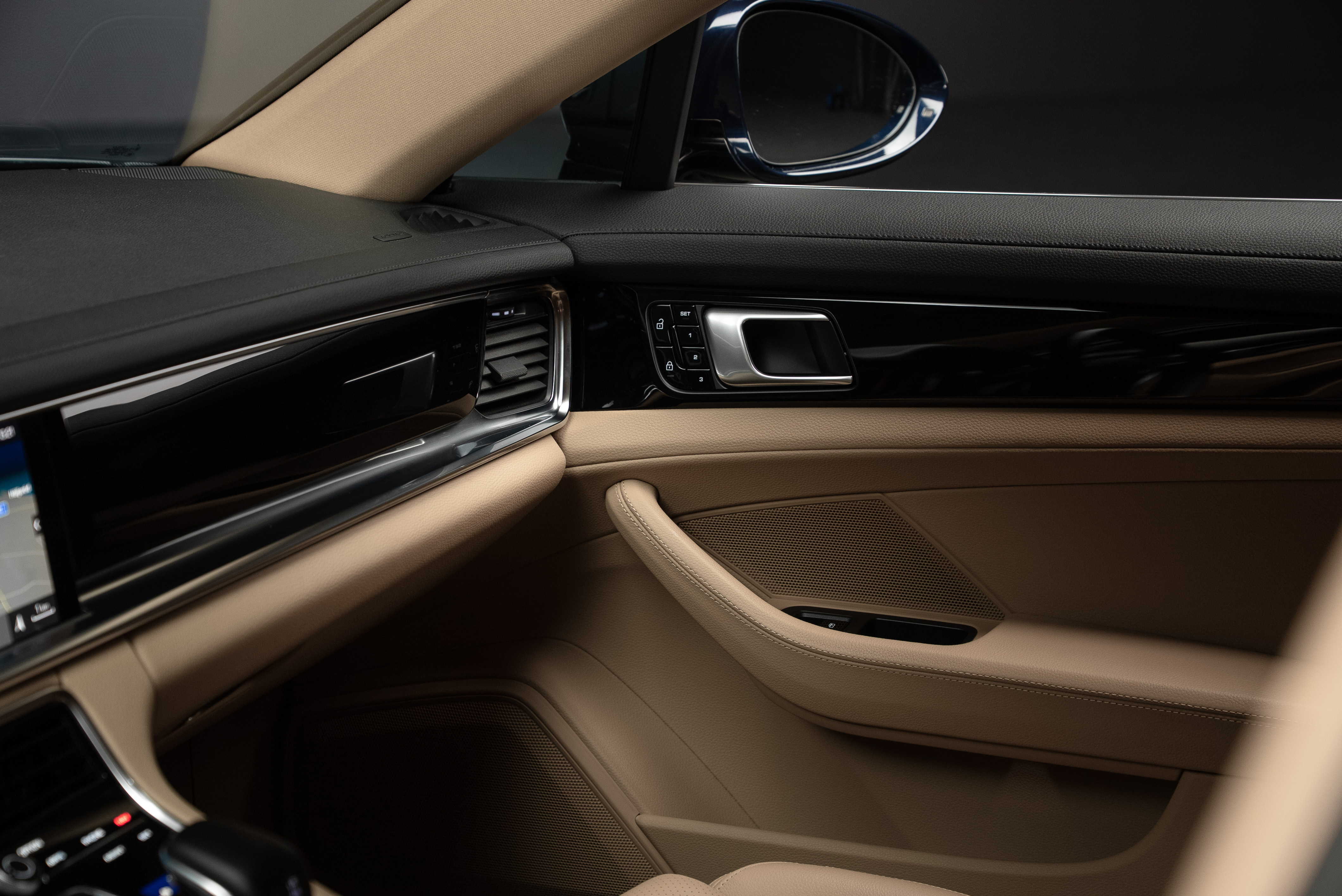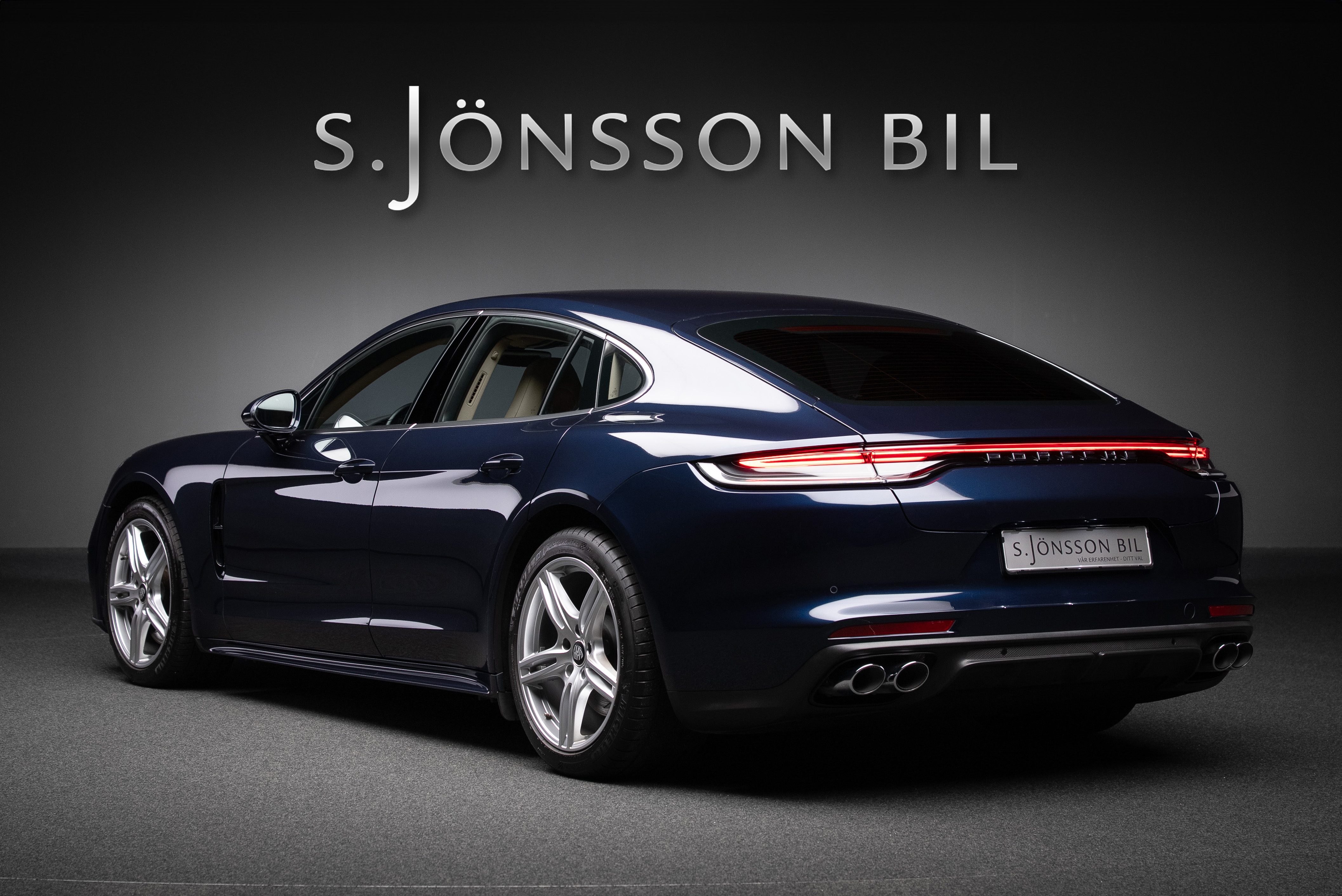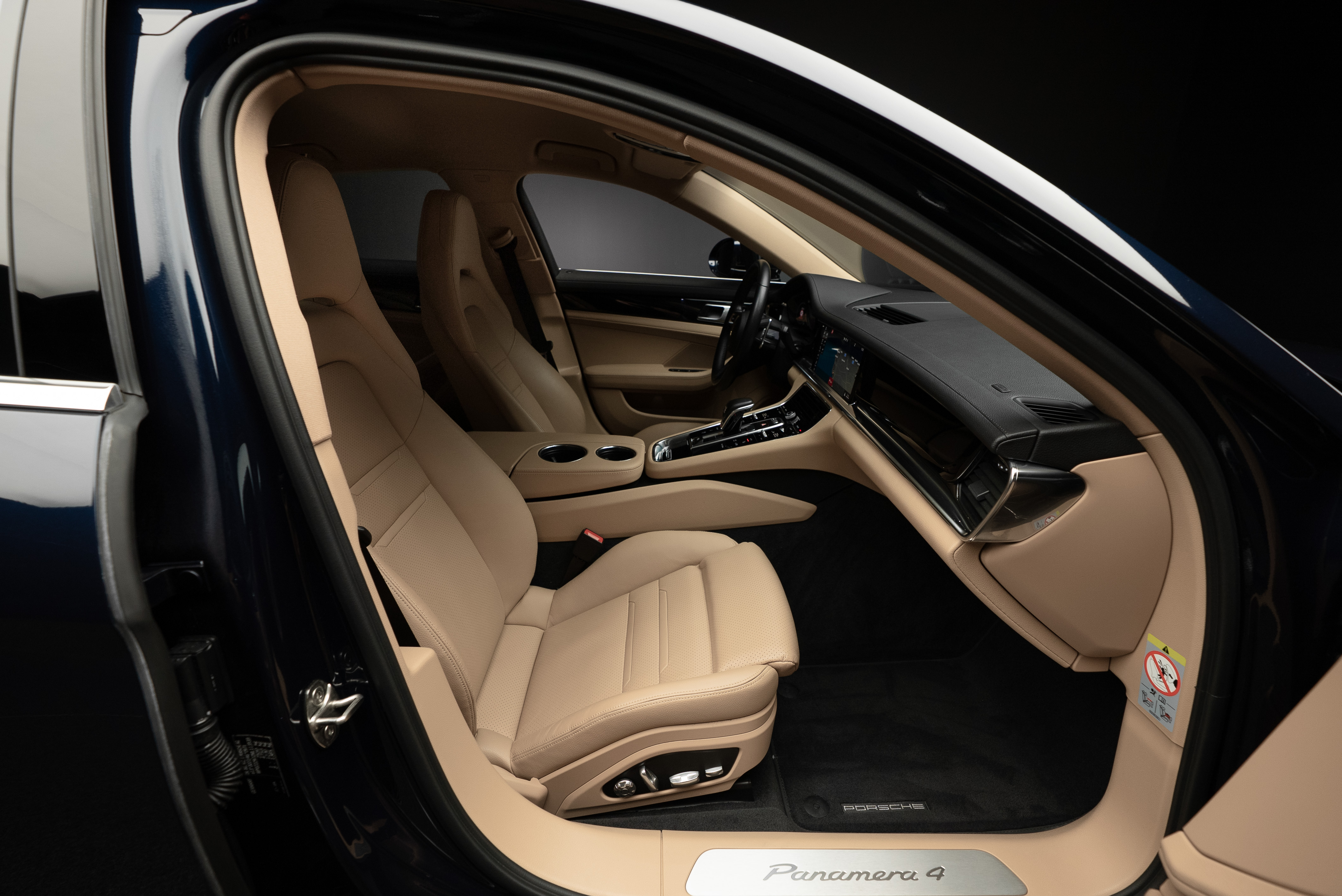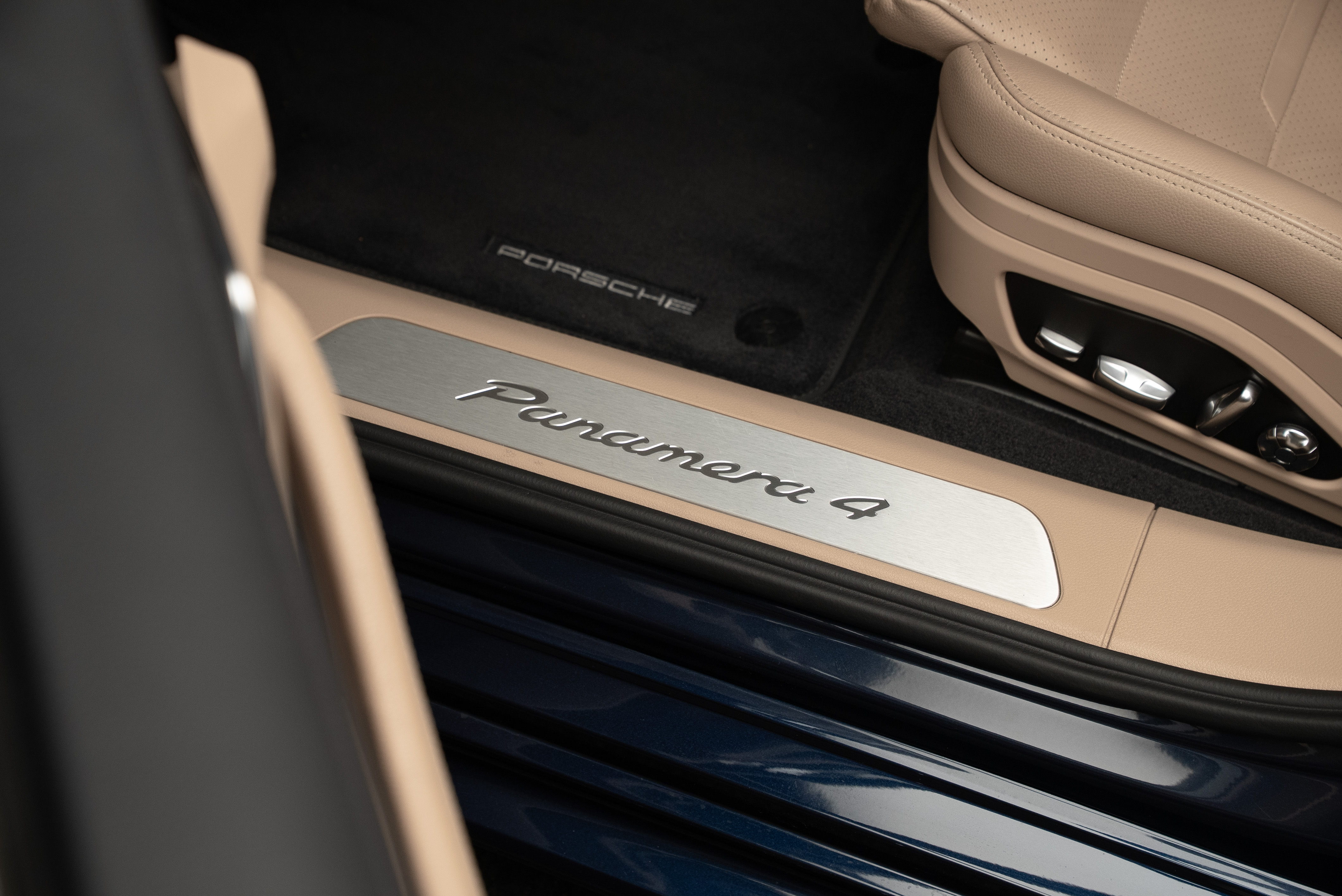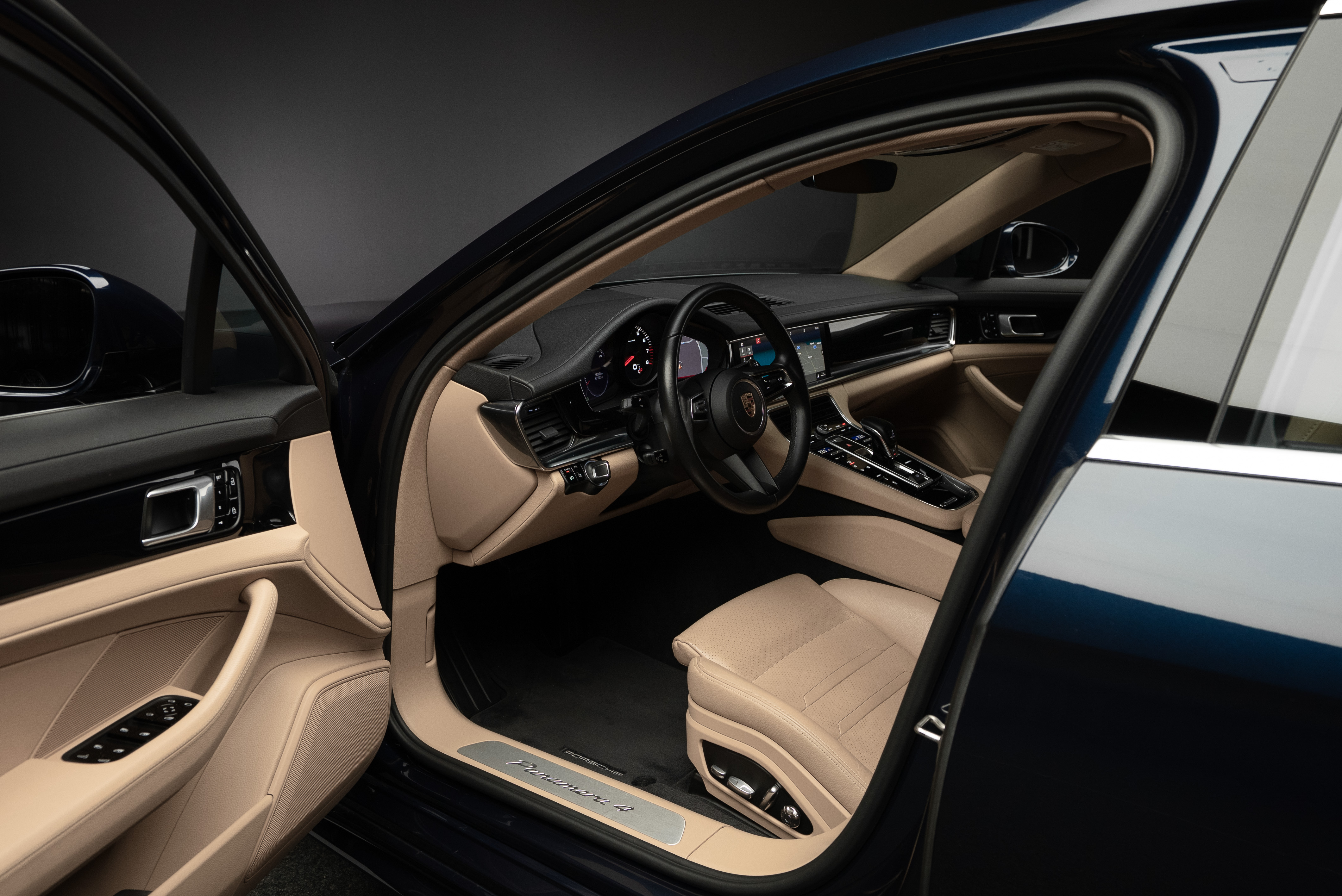 Porsche Panamera 4 lackerad i den eleganta kulören Night Blue Metallic kombinerat med beige läderinteriör.
