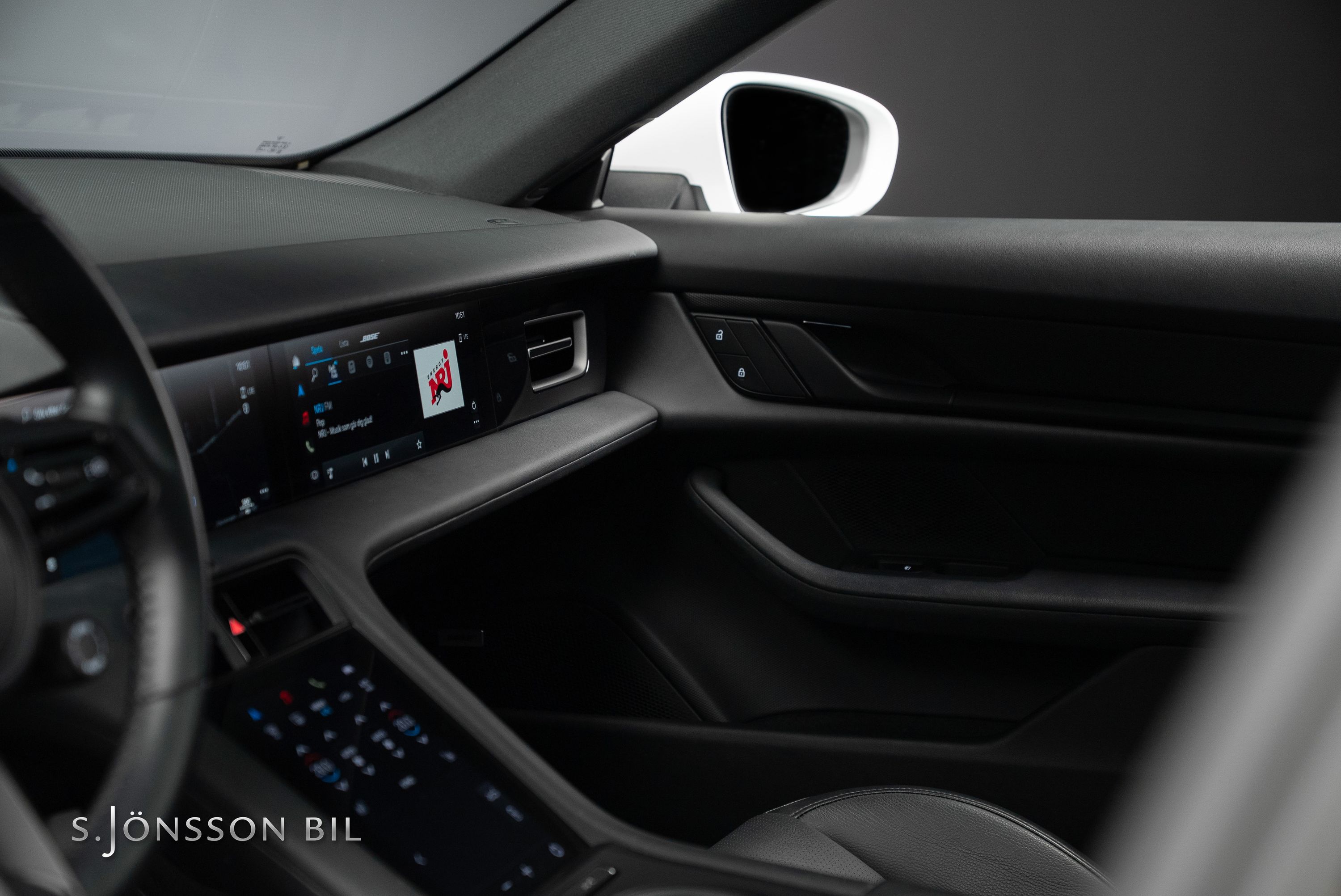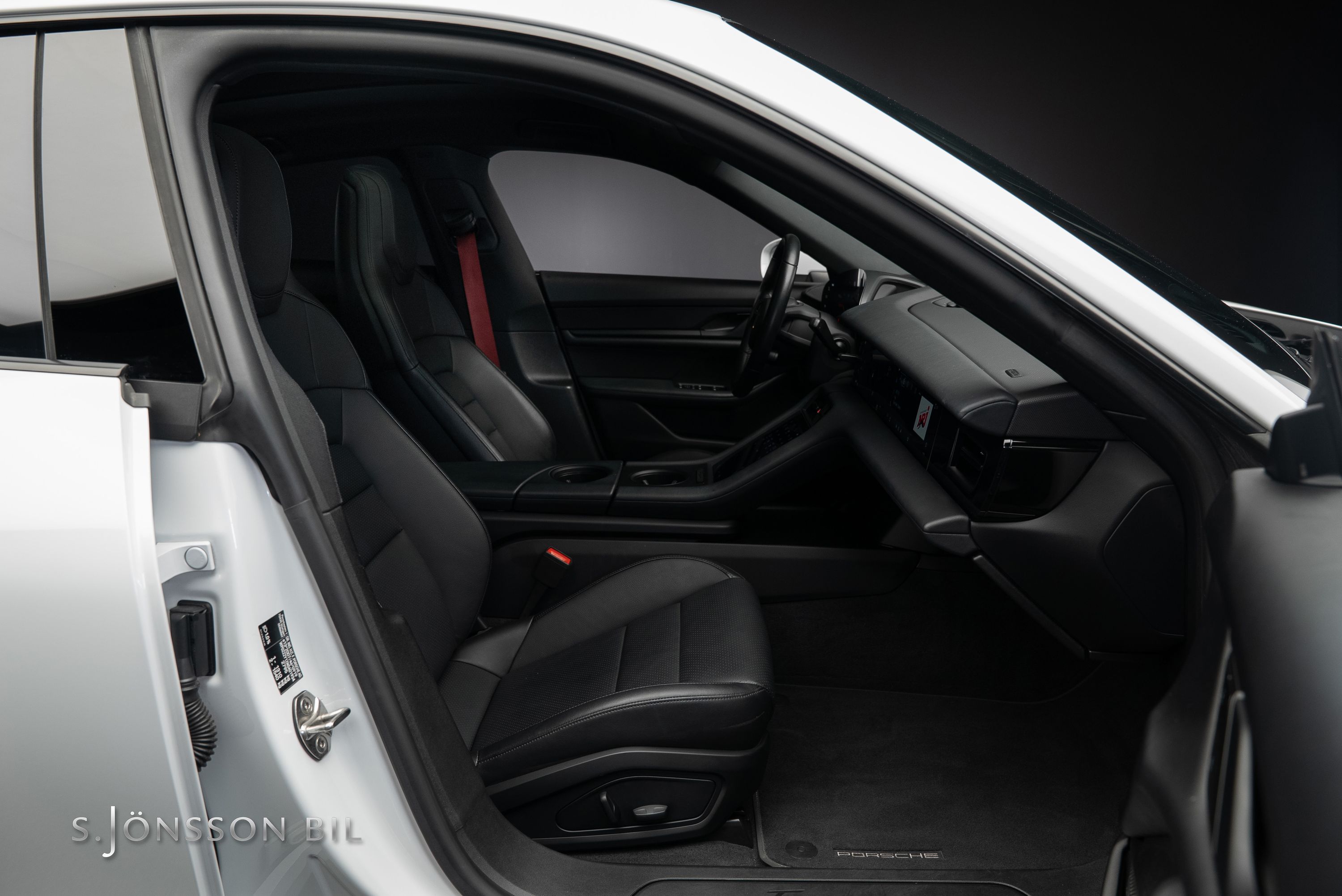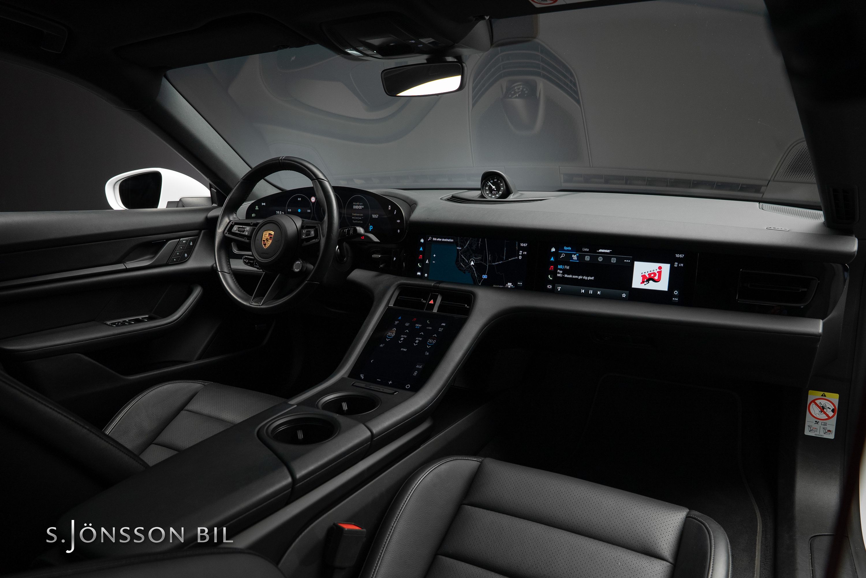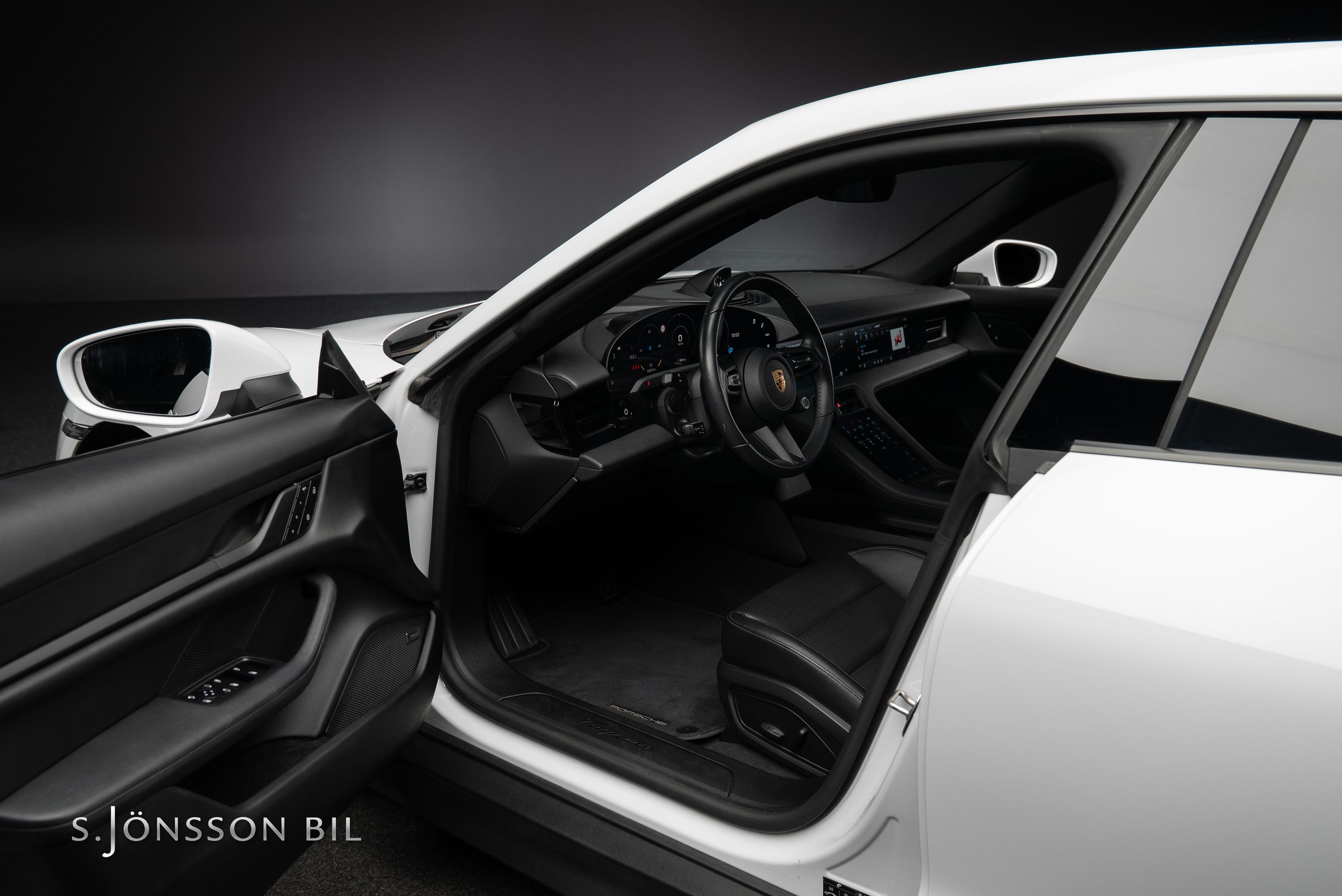 Porsche Taycan leasebar lackerad i White metallic med svart läderinteriör. En bil som kombinerar imponerande prestanda med klassisk Porsche-körkänsla. Den sportiga designen och den låga tyngdpunkten ger en stabil körupplevelse.