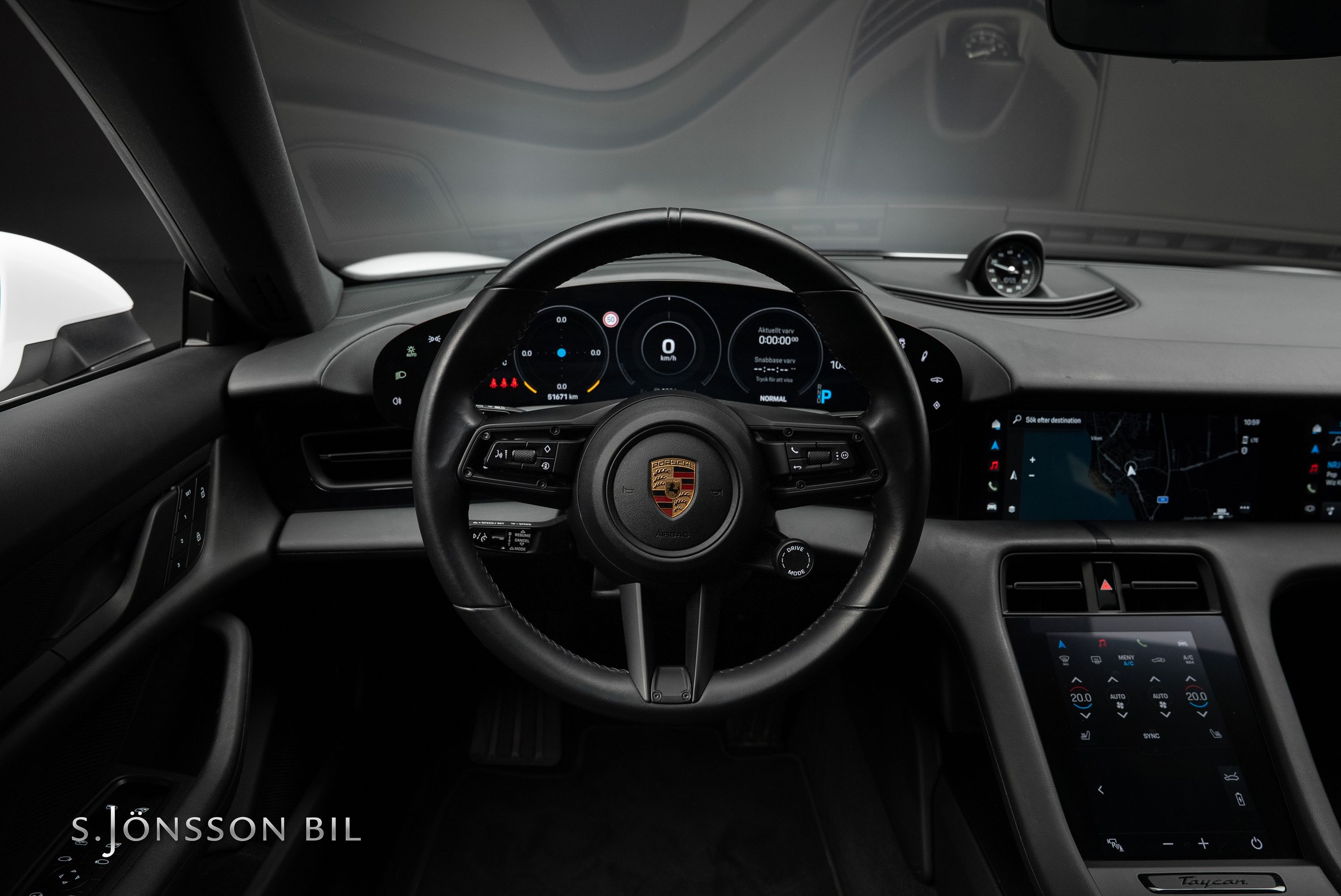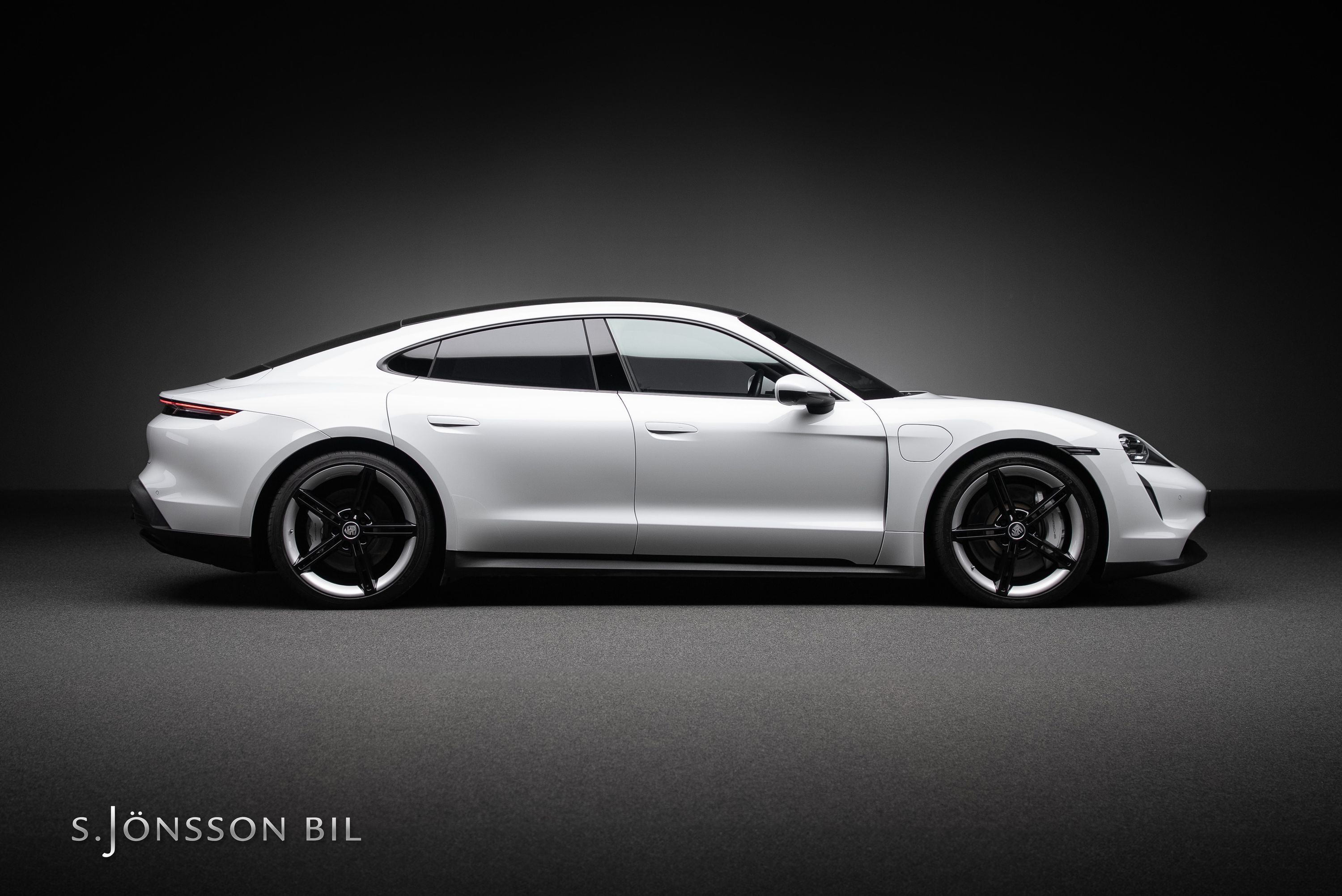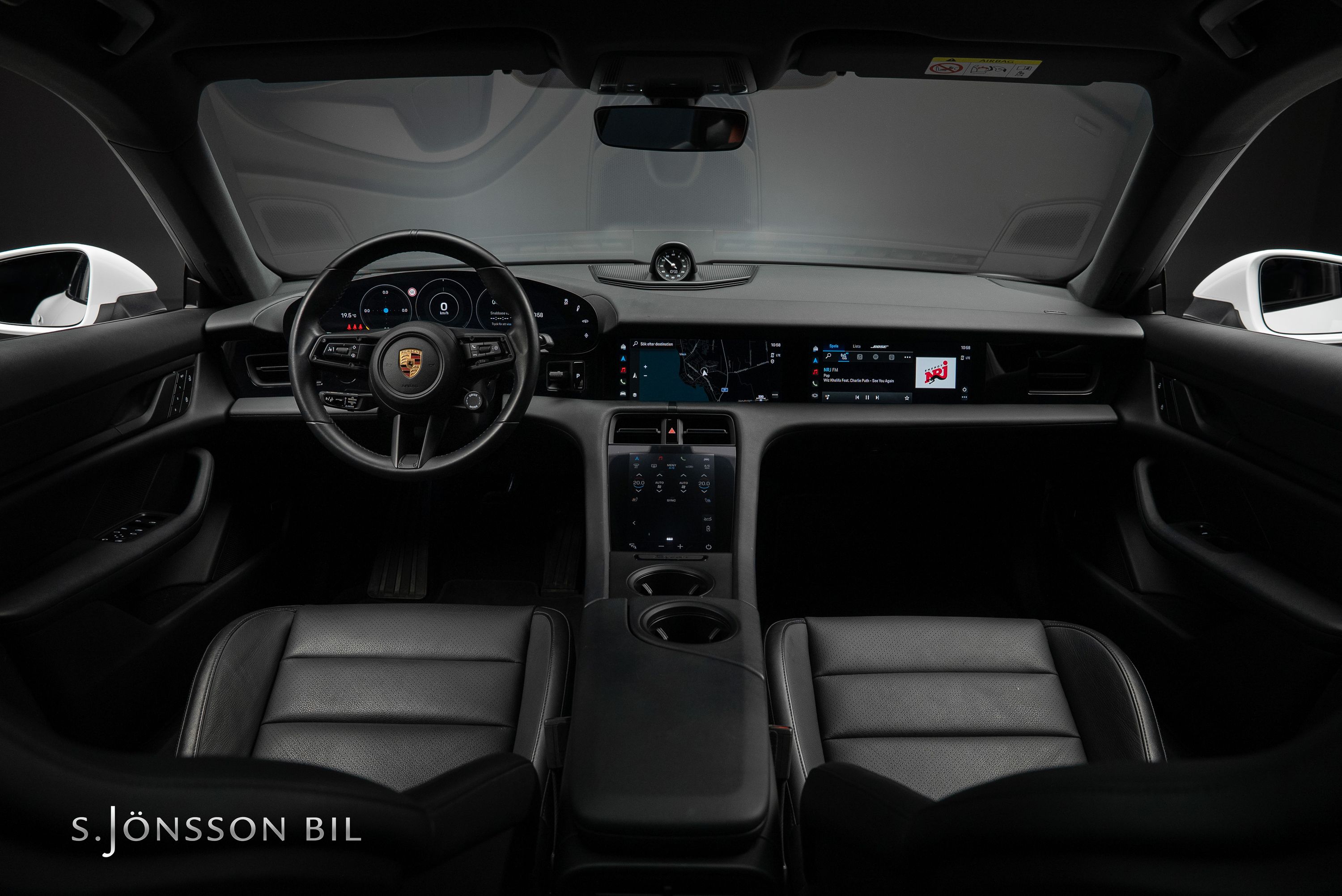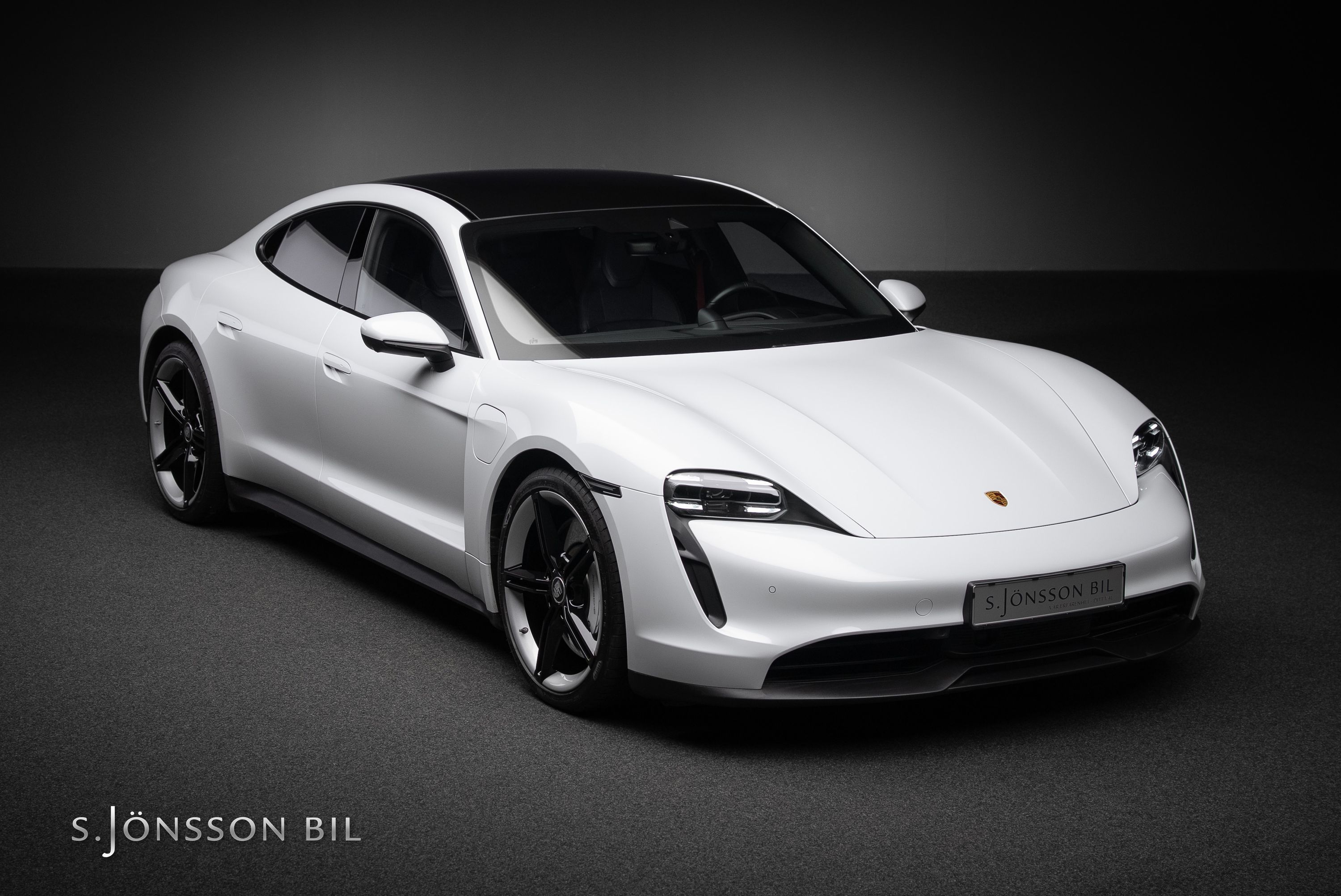 Porsche Taycan leasebar lackerad i White metallic med svart läderinteriör. En bil som kombinerar imponerande prestanda med klassisk Porsche-körkänsla. Den sportiga designen och den låga tyngdpunkten ger en stabil körupplevelse.